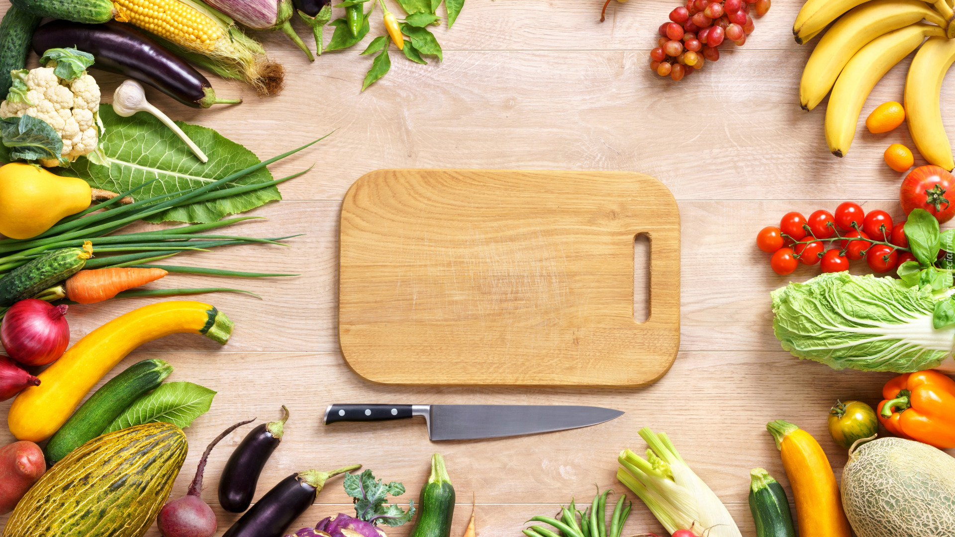 Edytor tapety: Deska i nóż pośród warzyw i owoców