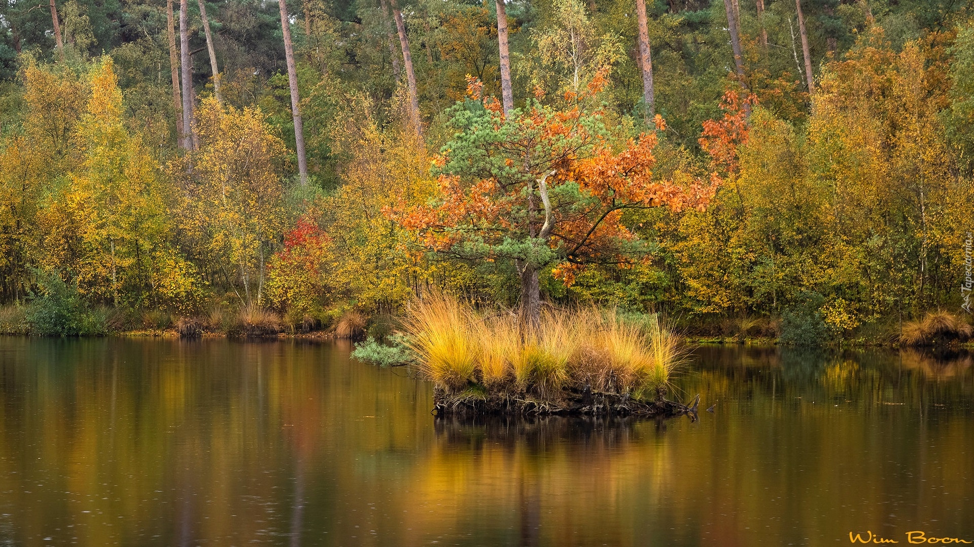 Edytor tapety: Sosna i kępki trawy na wysepce na jeziorze