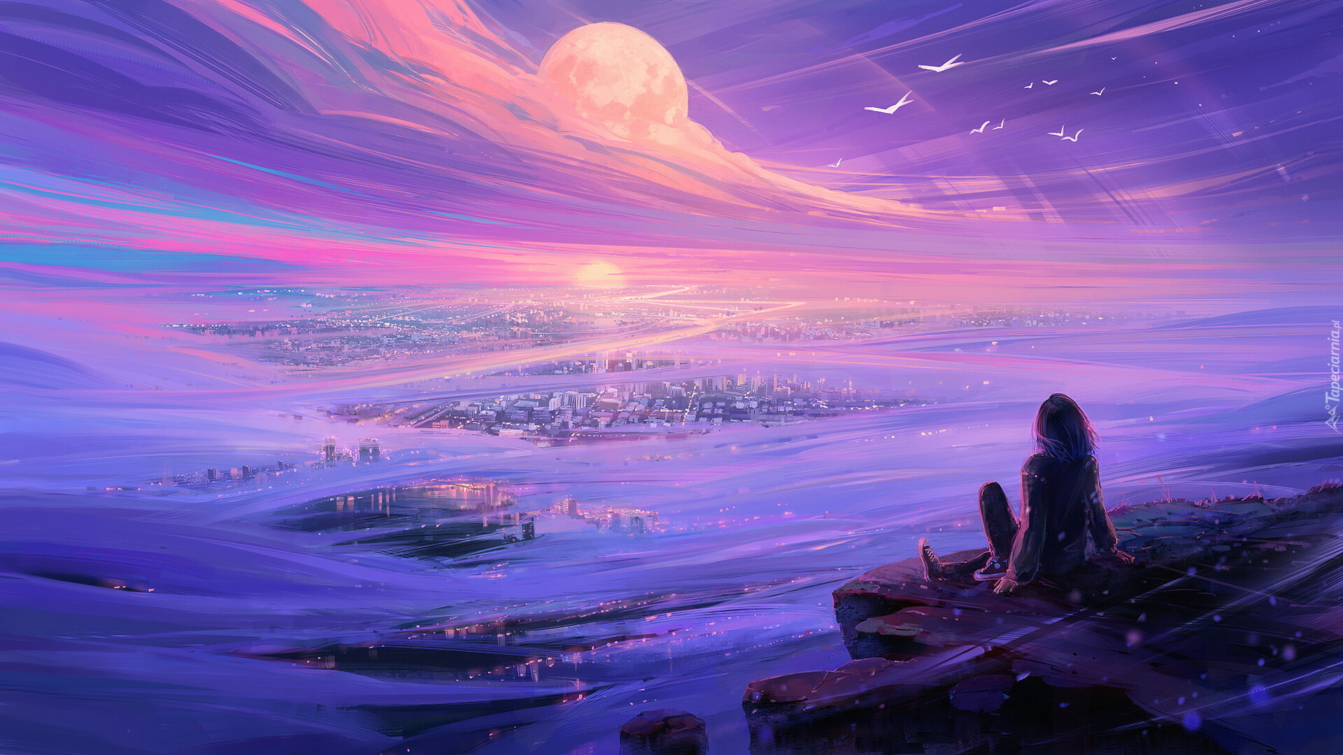 Edytor tapety: Dziewczyna na skale podziwiająca wschód słońca nad miastem