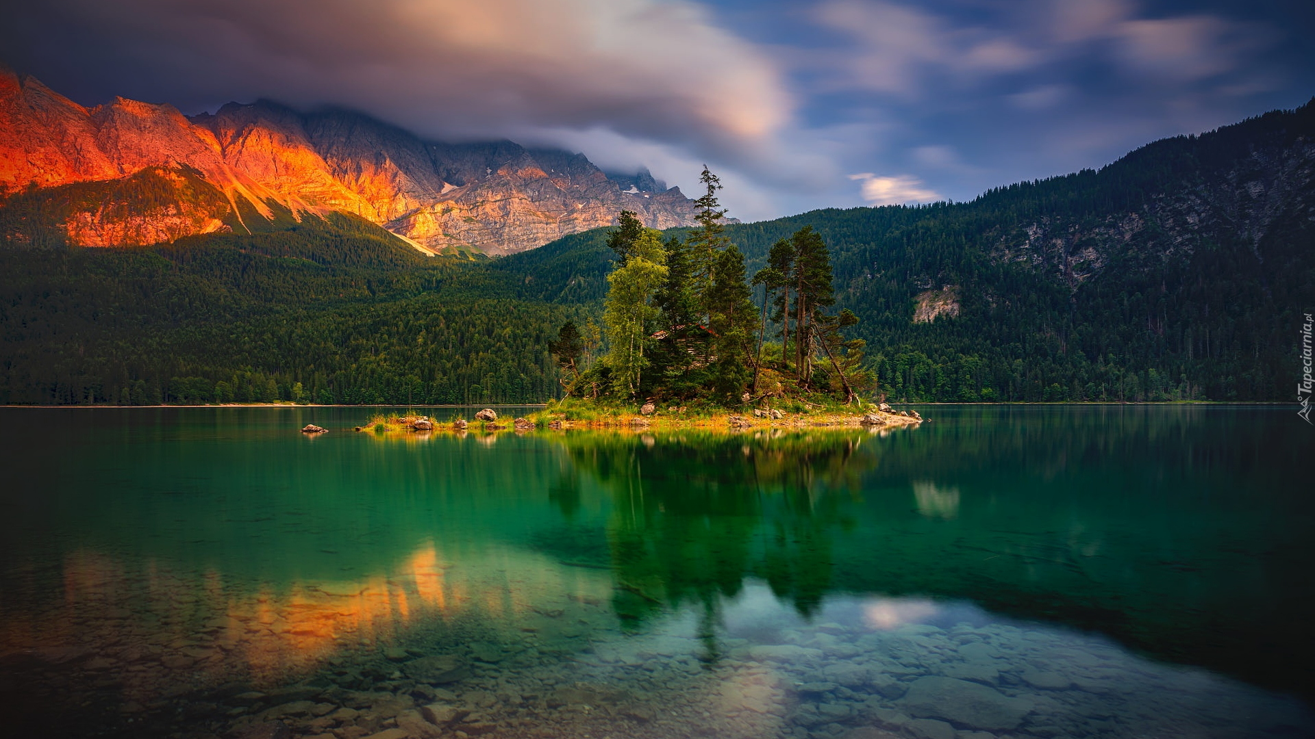 Edytor tapety: Dom pośród drzew na wysepce w jeziorze Eibsee