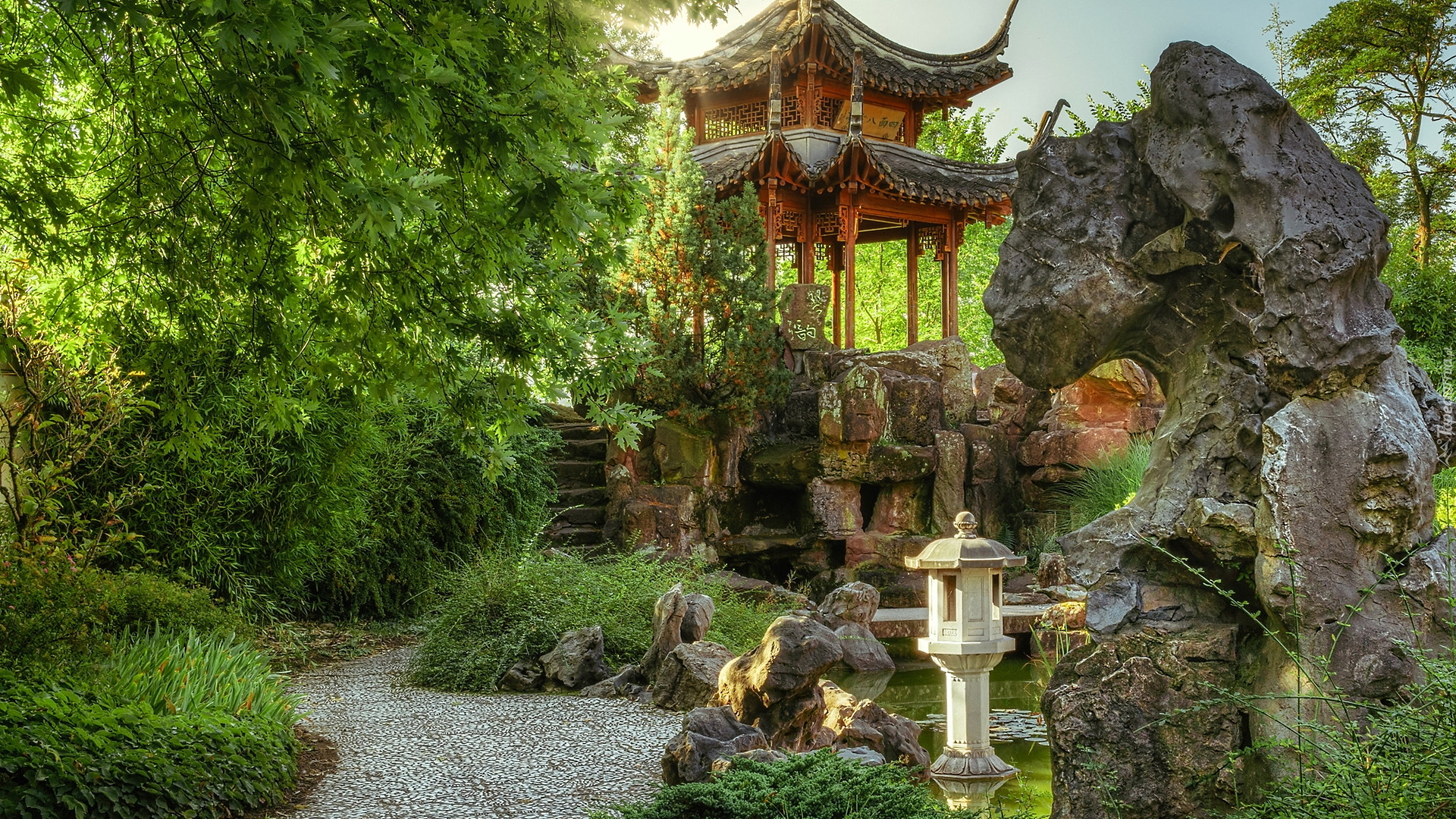Edytor tapety: Pawilon i staw w chińskim ogrodzie