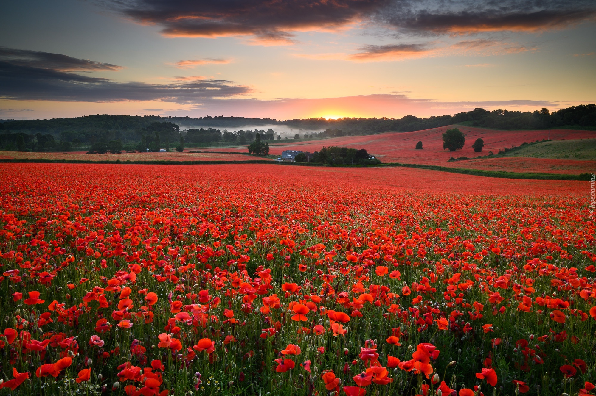 Edytor tapety: Drzewa na polu czerwonych maków