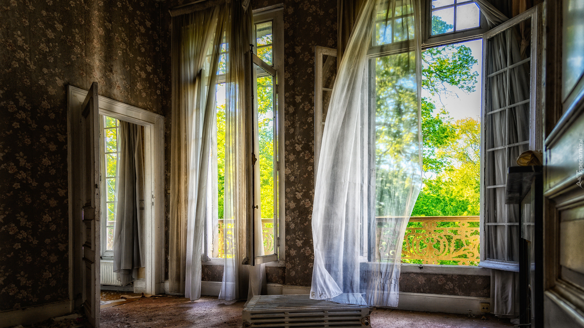Edytor tapety: Firanki na otwartych oknach w pokoju