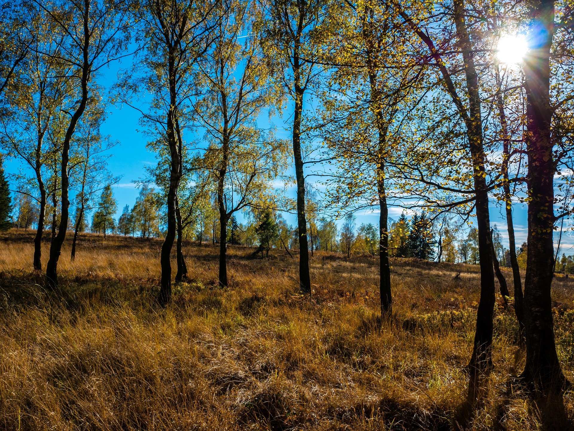 Edytor tapety: Rozświetlone słońcem drzewa w pożółkłej trawie