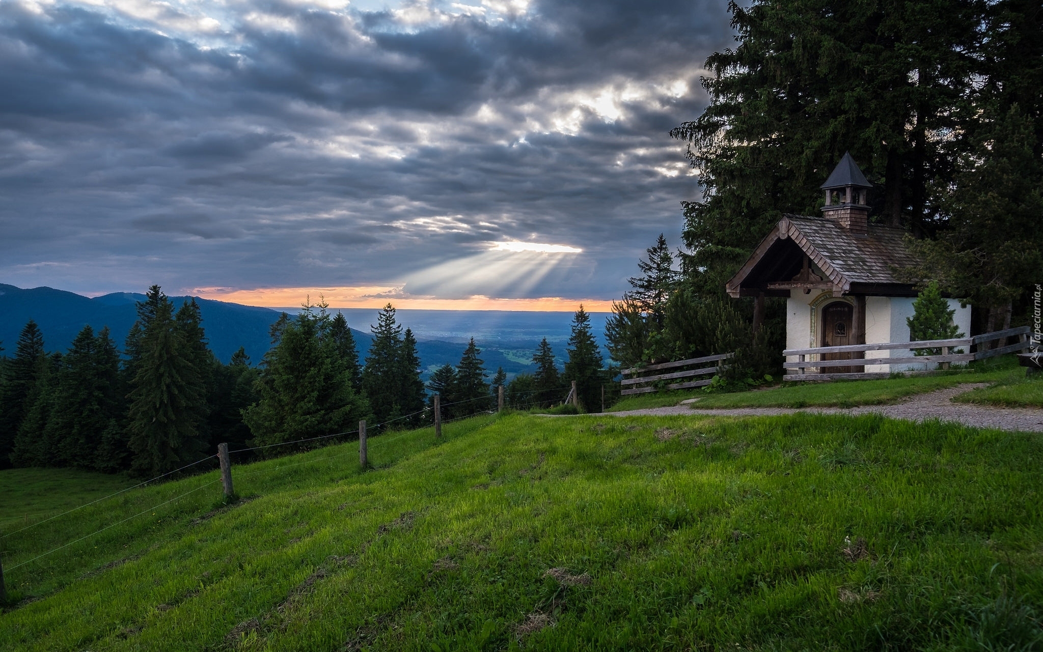 Edytor tapety: Kapliczka pod drzewami na wzgórzu