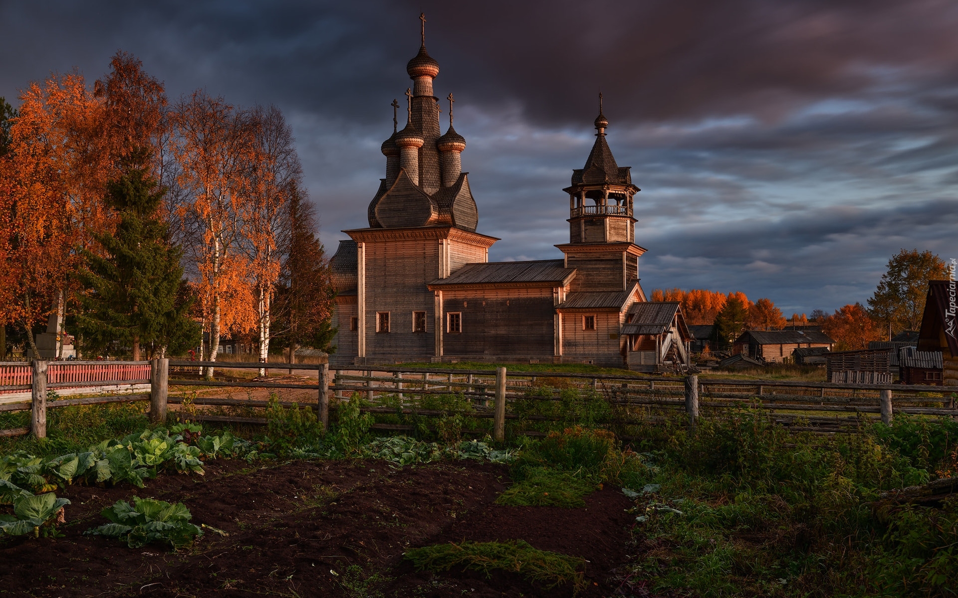 Edytor tapety: Cerkiew i jesienne drzewa za ogrodzeniem