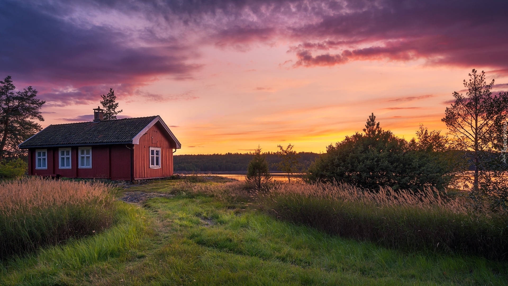 Edytor tapety: Dom i drzewa nad jeziorem Vaeleren