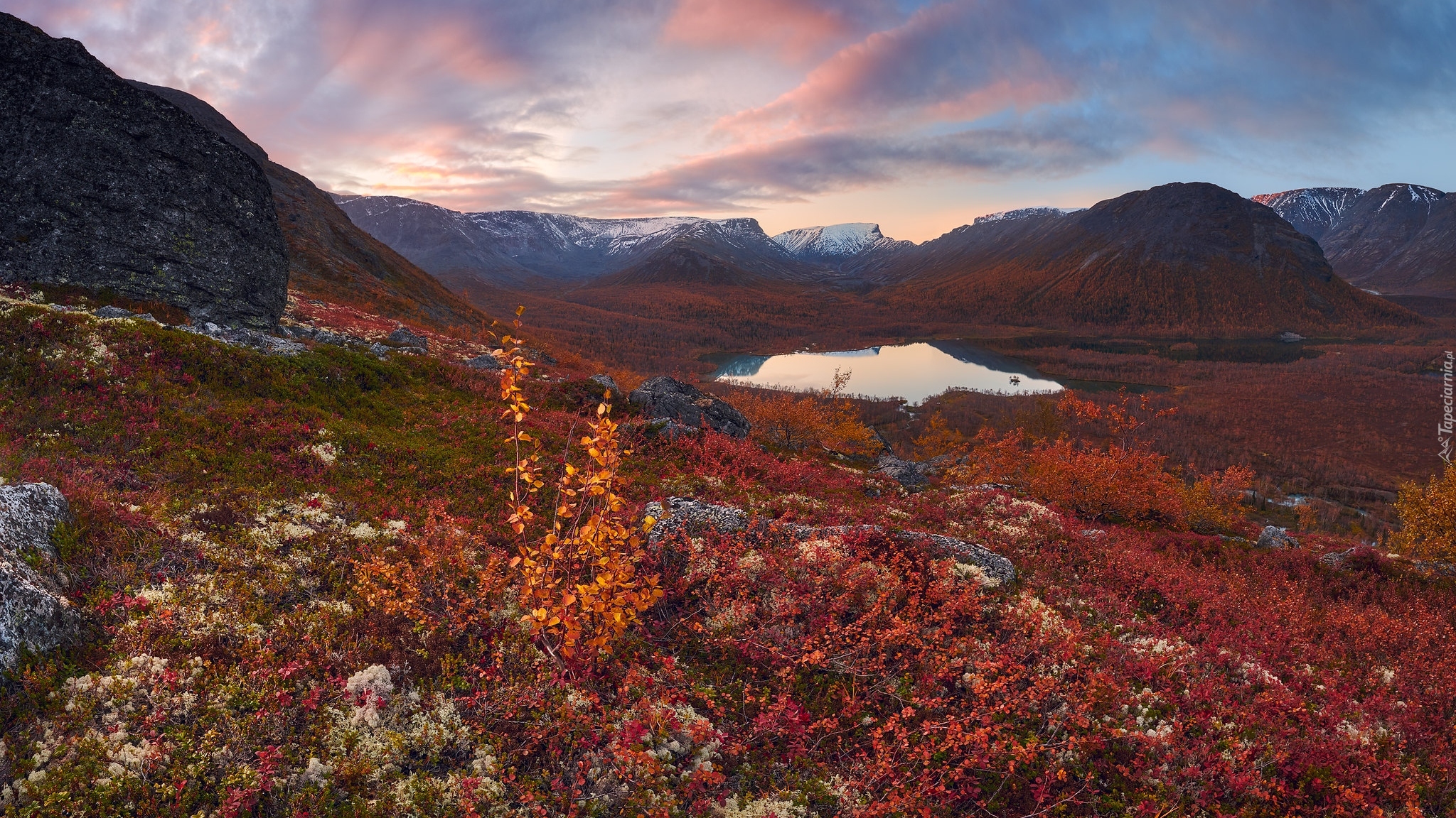 Edytor tapety: Jezioro i jesienna roślinność na tle gór Chibiny