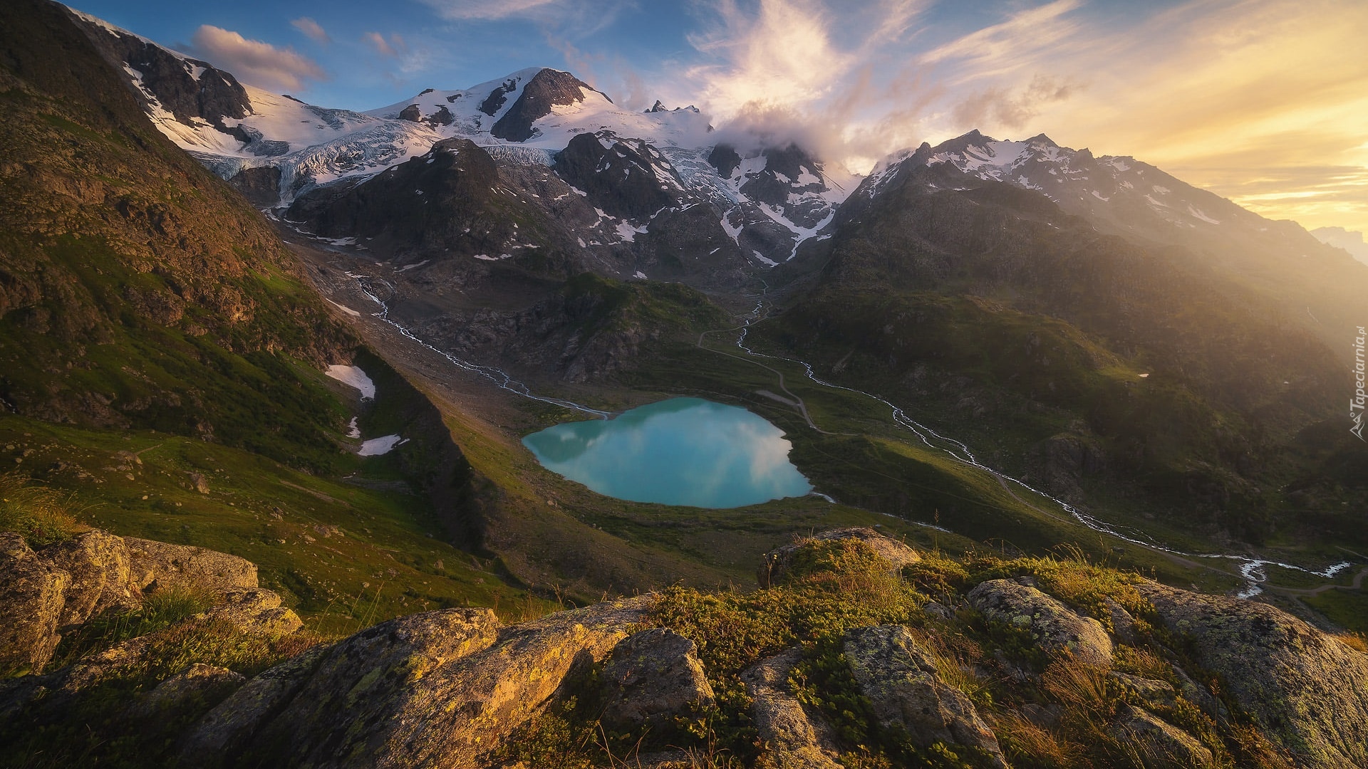 Edytor tapety: Wschód słońca nad górskim jeziorem w Szwajcarii