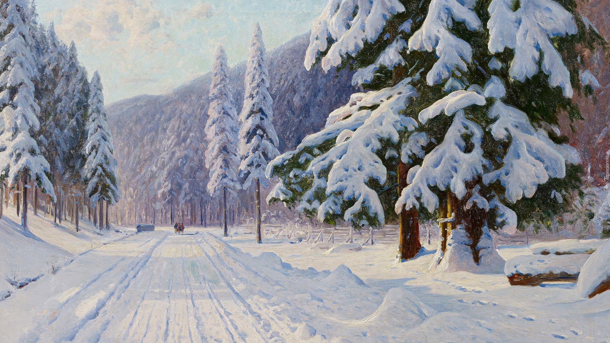 Edytor tapety: Zaśnieżona droga i drzewa na obrazie Waltera Morasa