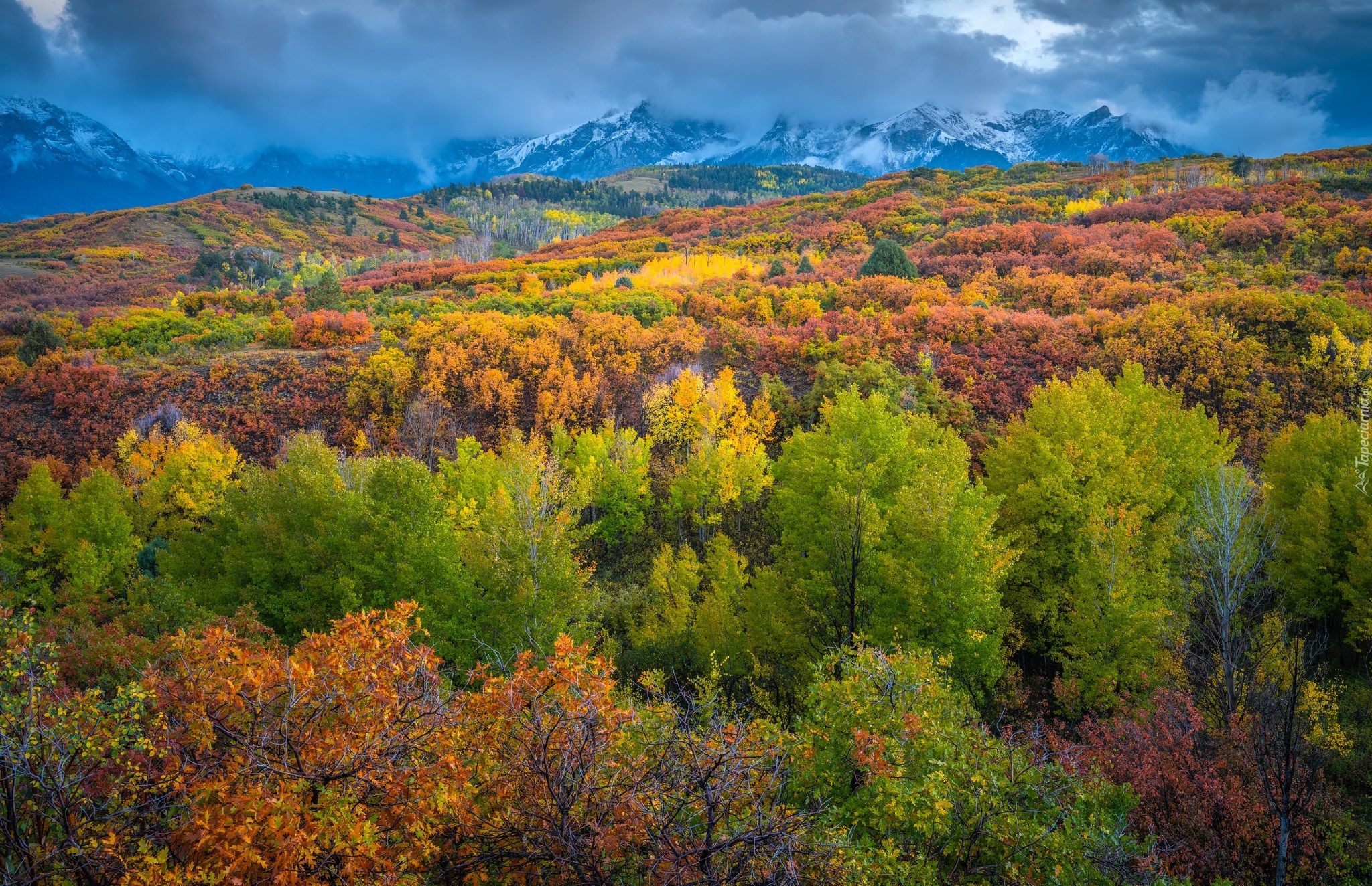 Edytor tapety: Kolorowe drzewa i zamglone góry w oddali
