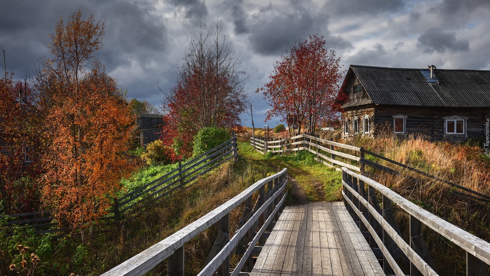 Edytor tapety: Ogrodzony dom i drzewa obok mostku