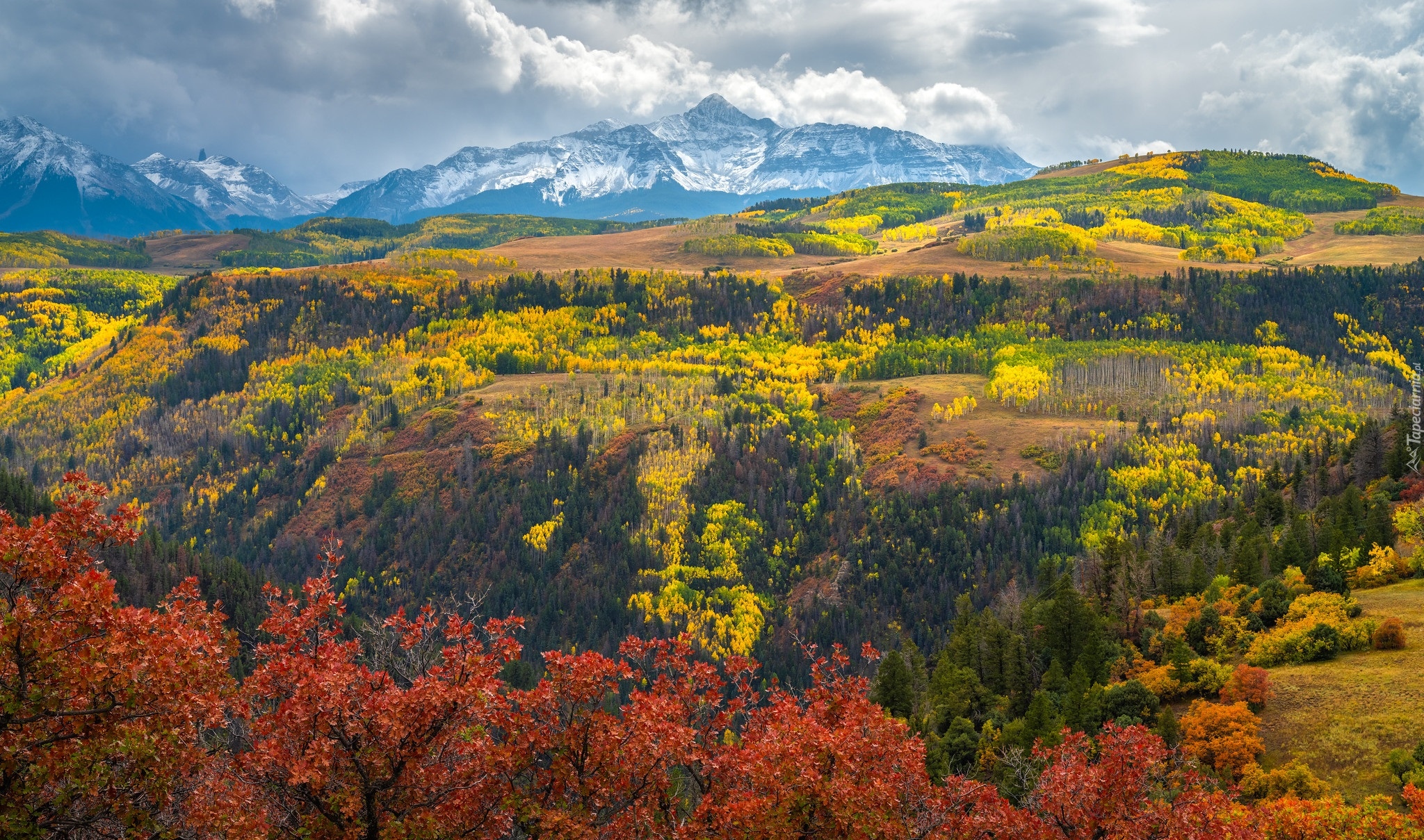 Edytor tapety: Kolorowe jesienne drzewa na tle chmur nad górami