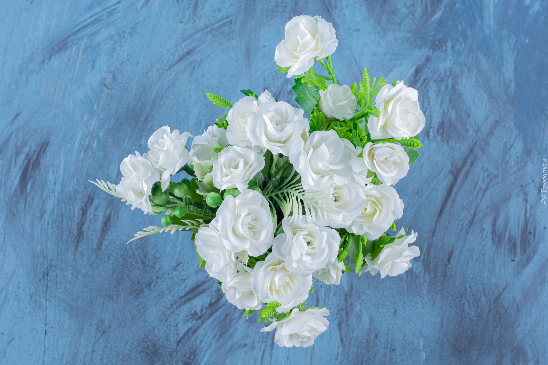 Edytor tapety: Bukiet białych róż na niebieskim tle