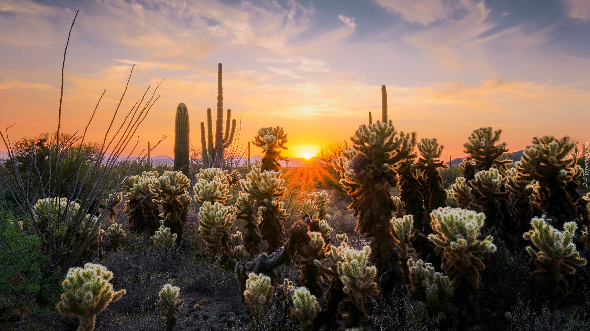 Edytor tapety: Kaktusy cholla w blasku wschodzącego słońca