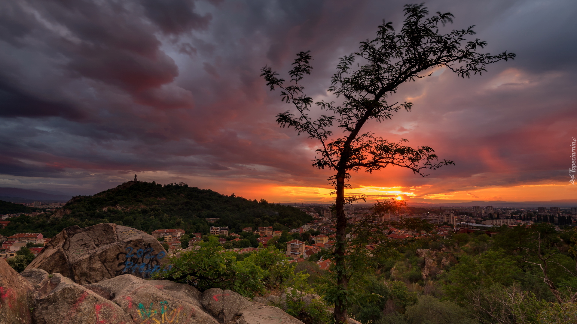 Edytor tapety: Drzewo na tle zachodu słońca nad miastem