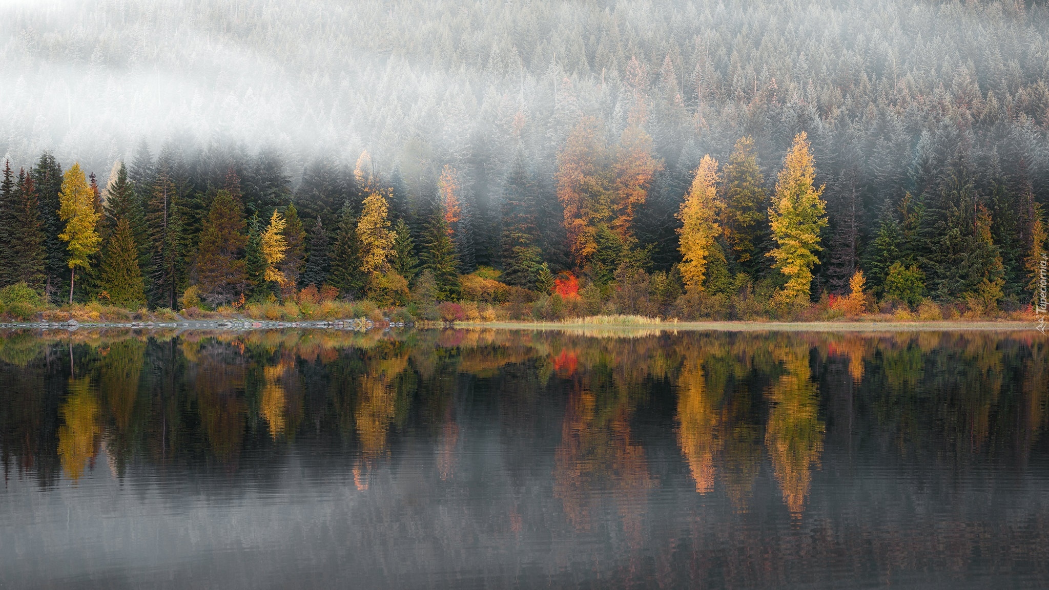 Edytor tapety: Zamglony jesienny las nad jeziorem