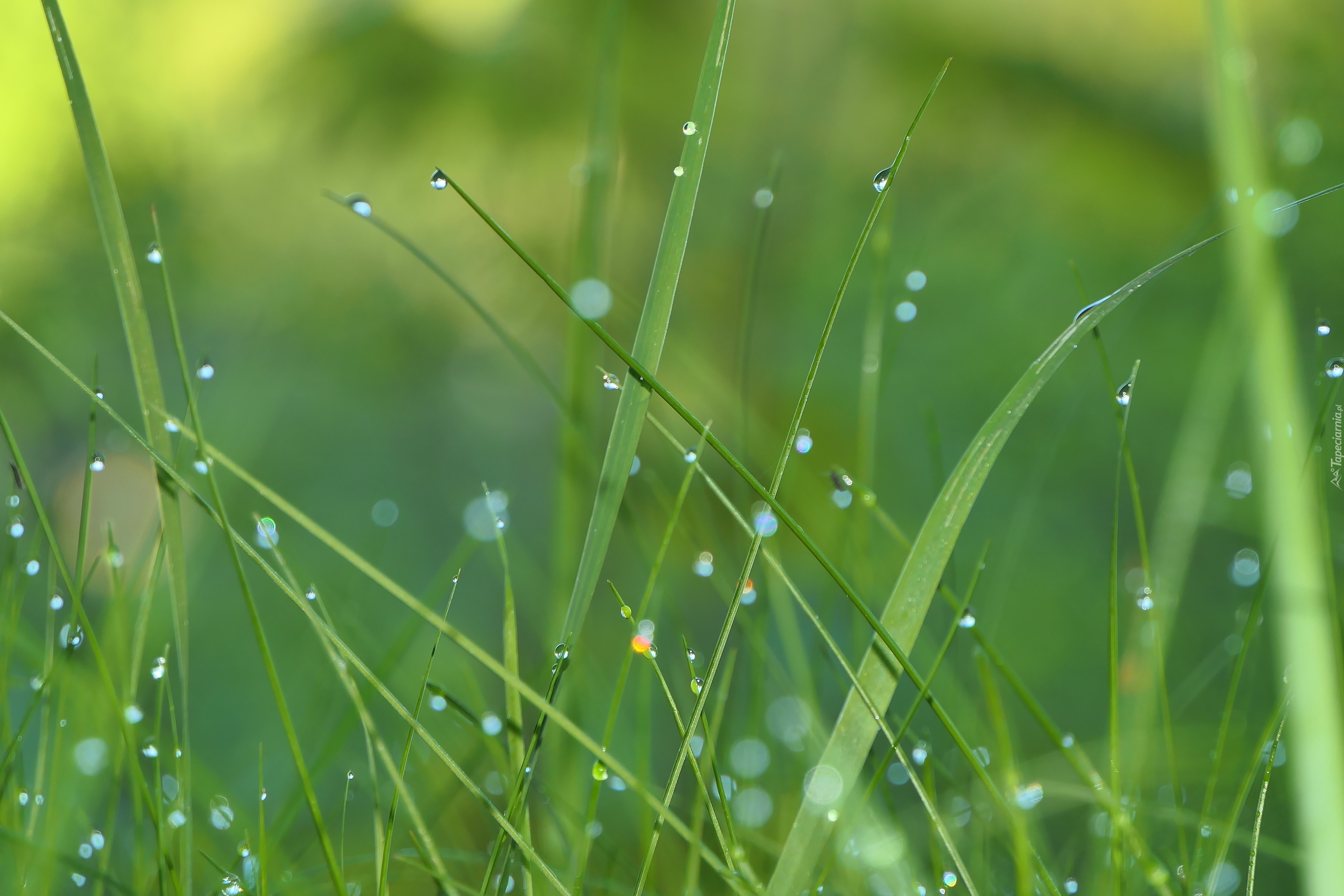 Edytor tapety: Krople rosy na zielonej trawie