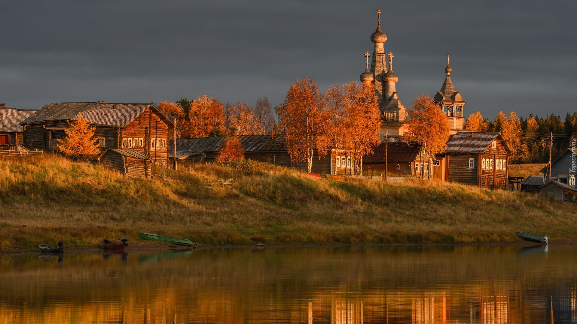 Edytor tapety: Rozświetlone słońcem domy i cerkiew nad rzeką