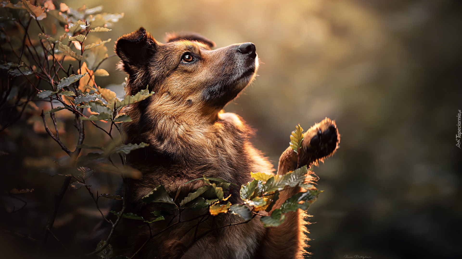Edytor tapety: Pies z uniesioną łapką przy gałązkach