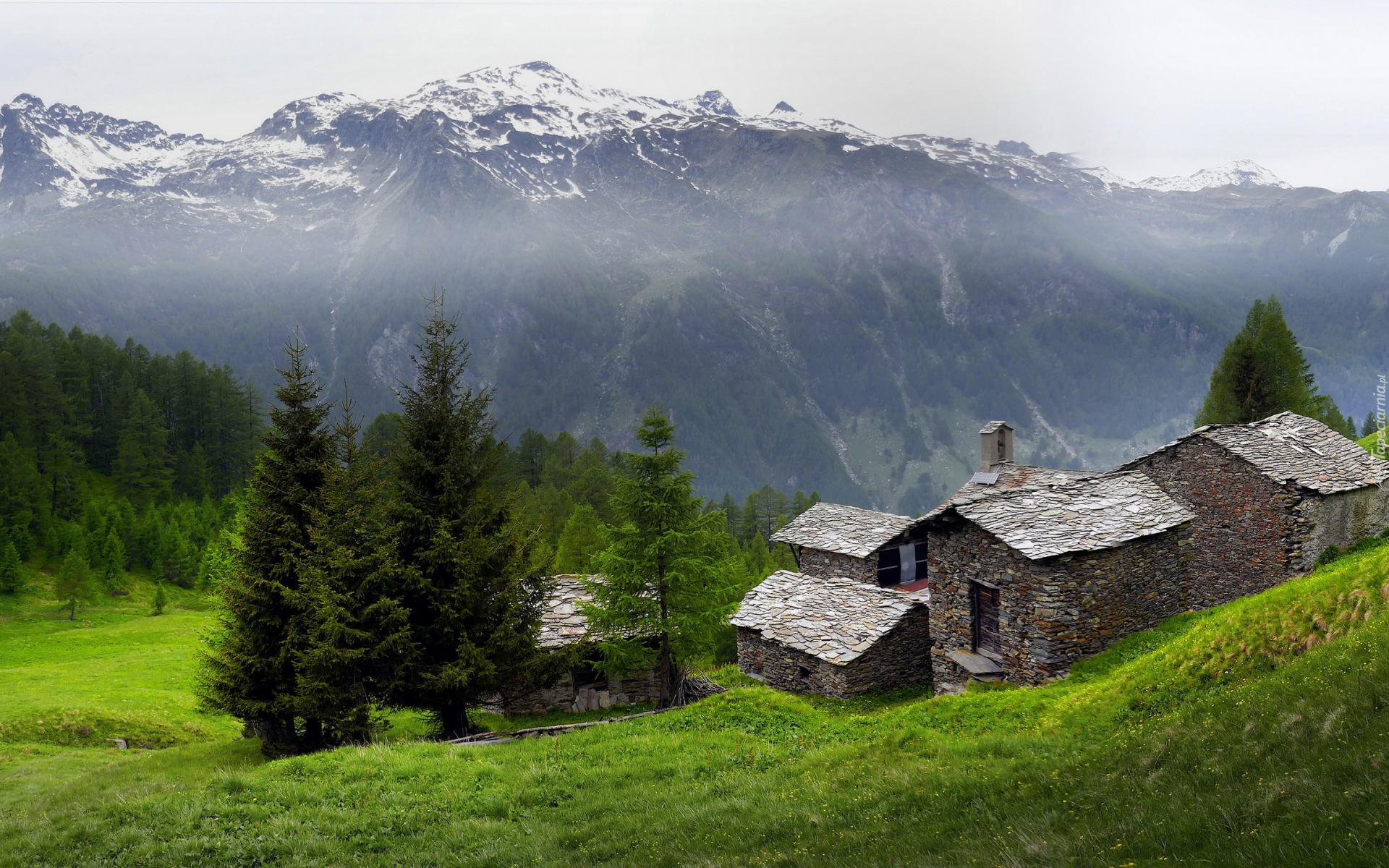 Edytor tapety: Drzewa przy kamiennych domach na tle gór