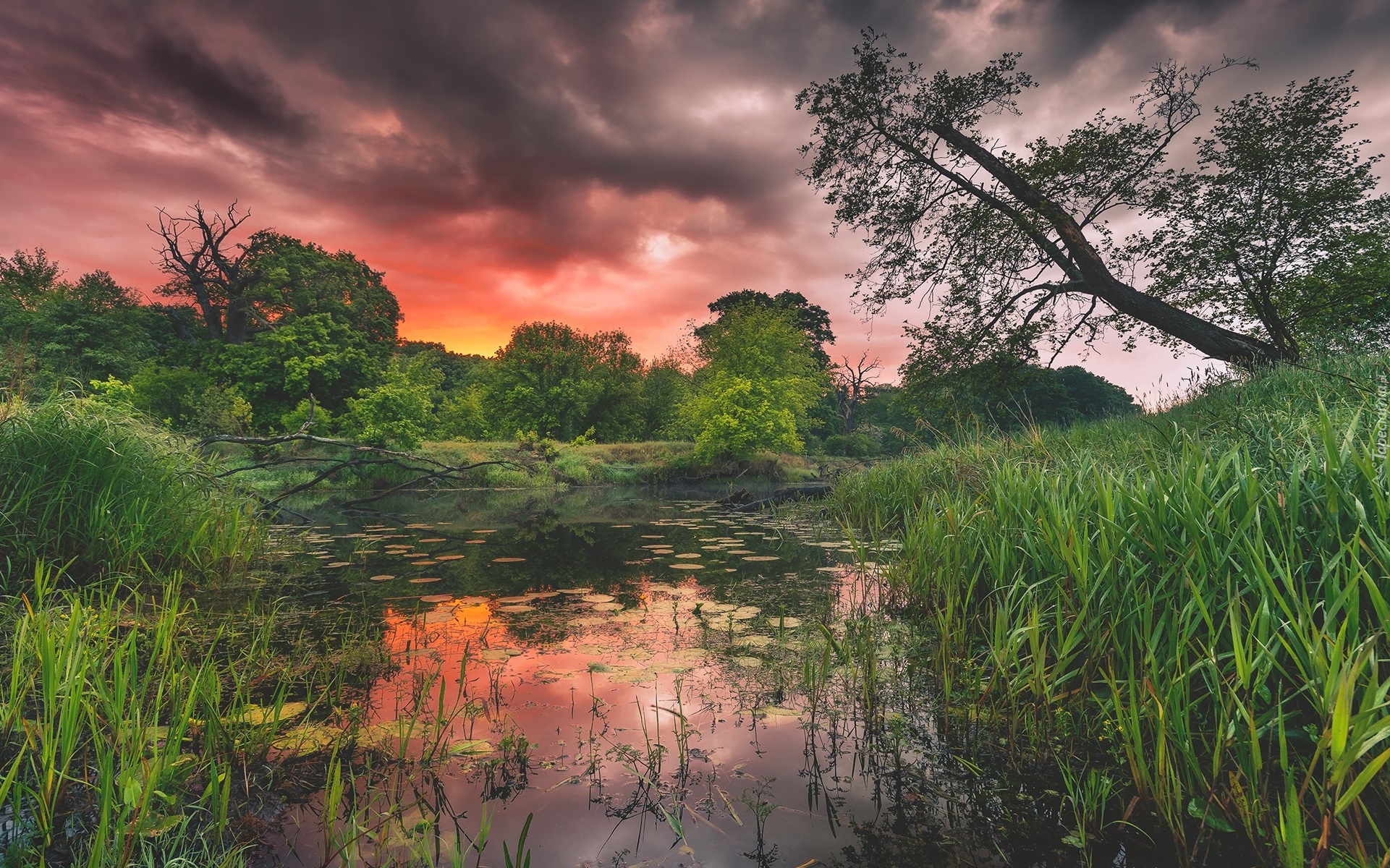 Edytor tapety: Drzewa i rośliny nad rzeką w zachodzącym słońcu