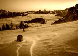 Edytor tapety: Widok z ośnieżonego wzgórza na góre spowite mgłą