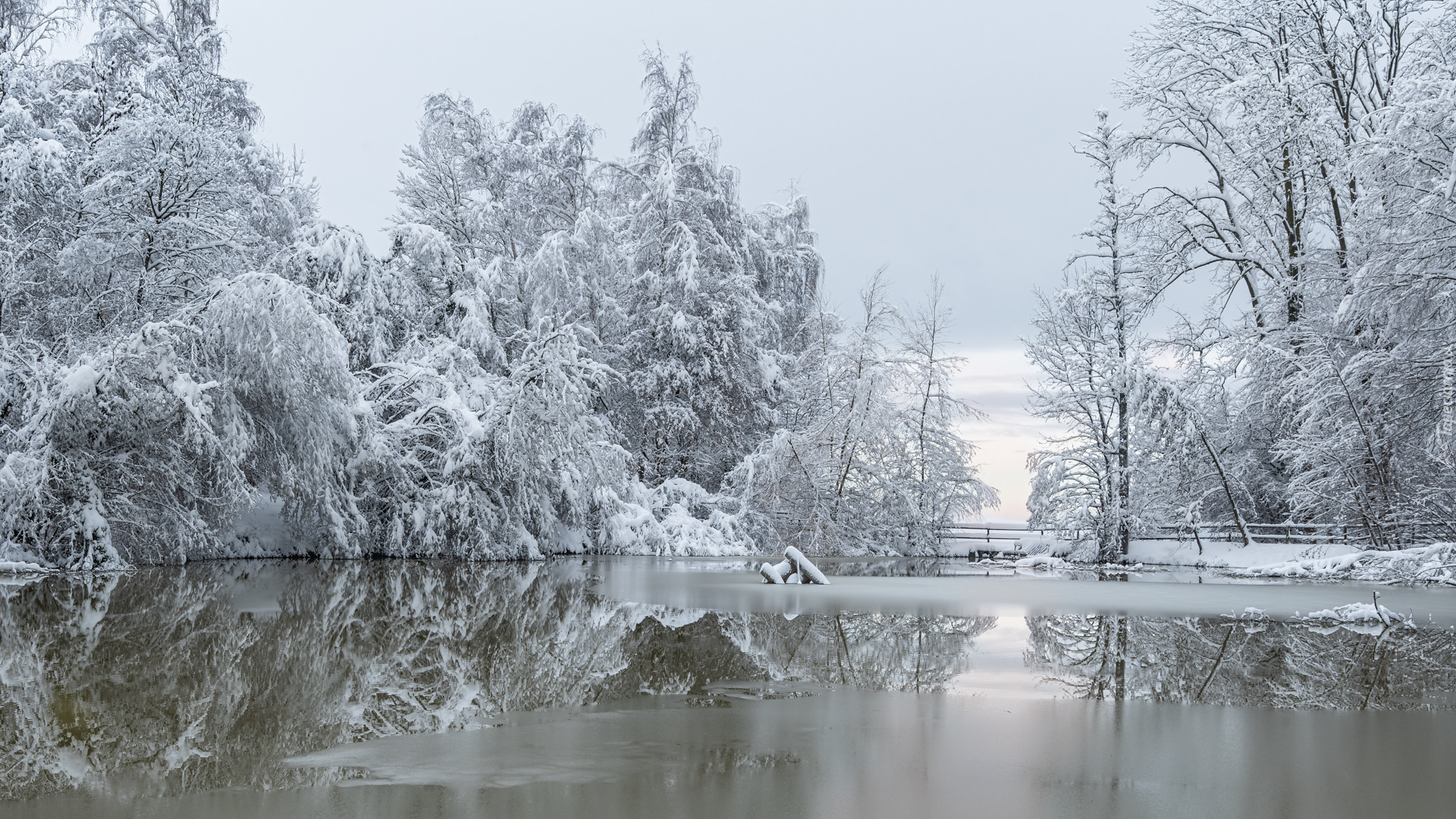 Edytor tapety: Zaśnieżone drzewa nad zamarzającą rzeką