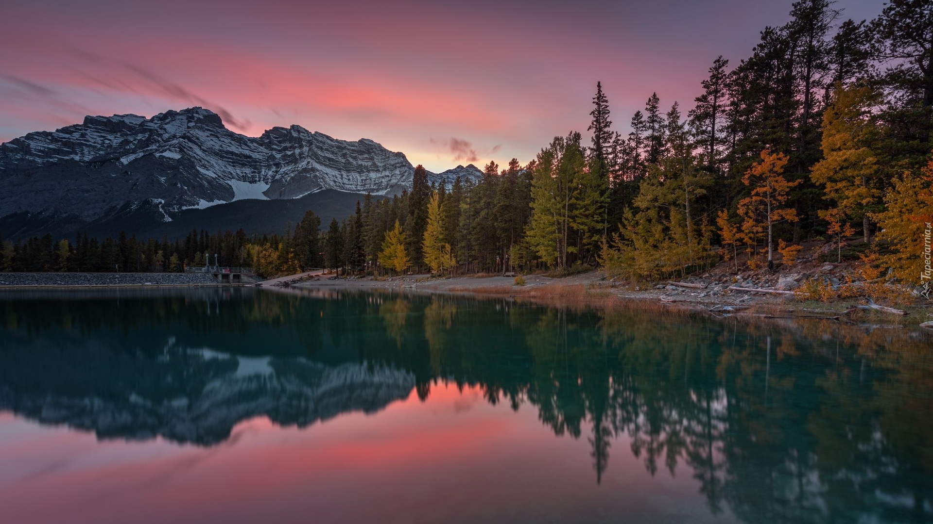 Edytor tapety: Odbicie kolorowego nieba i drzew w górskim jeziorze