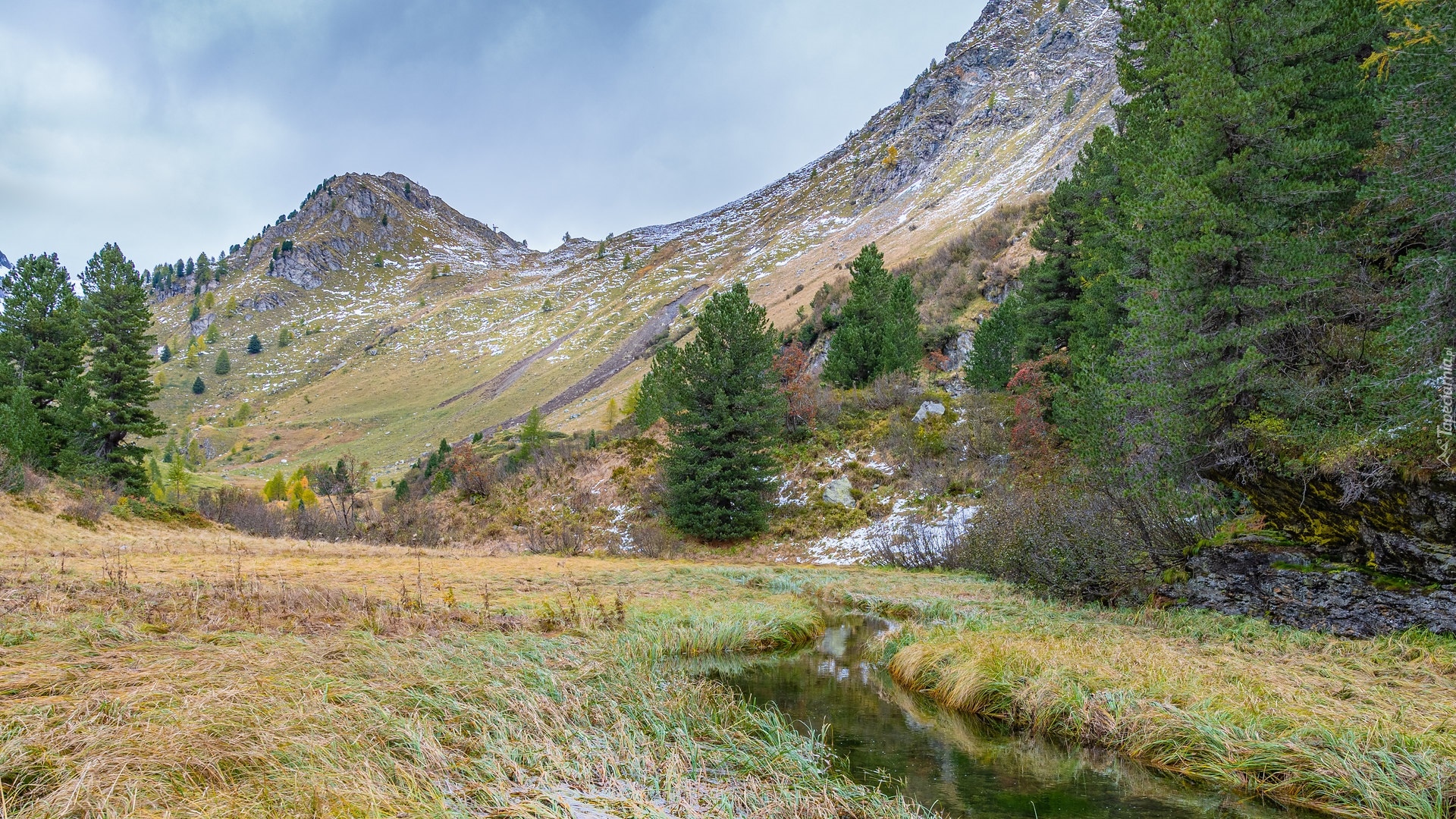 Edytor tapety: Oszroniona trawa nad strumieniem w górach