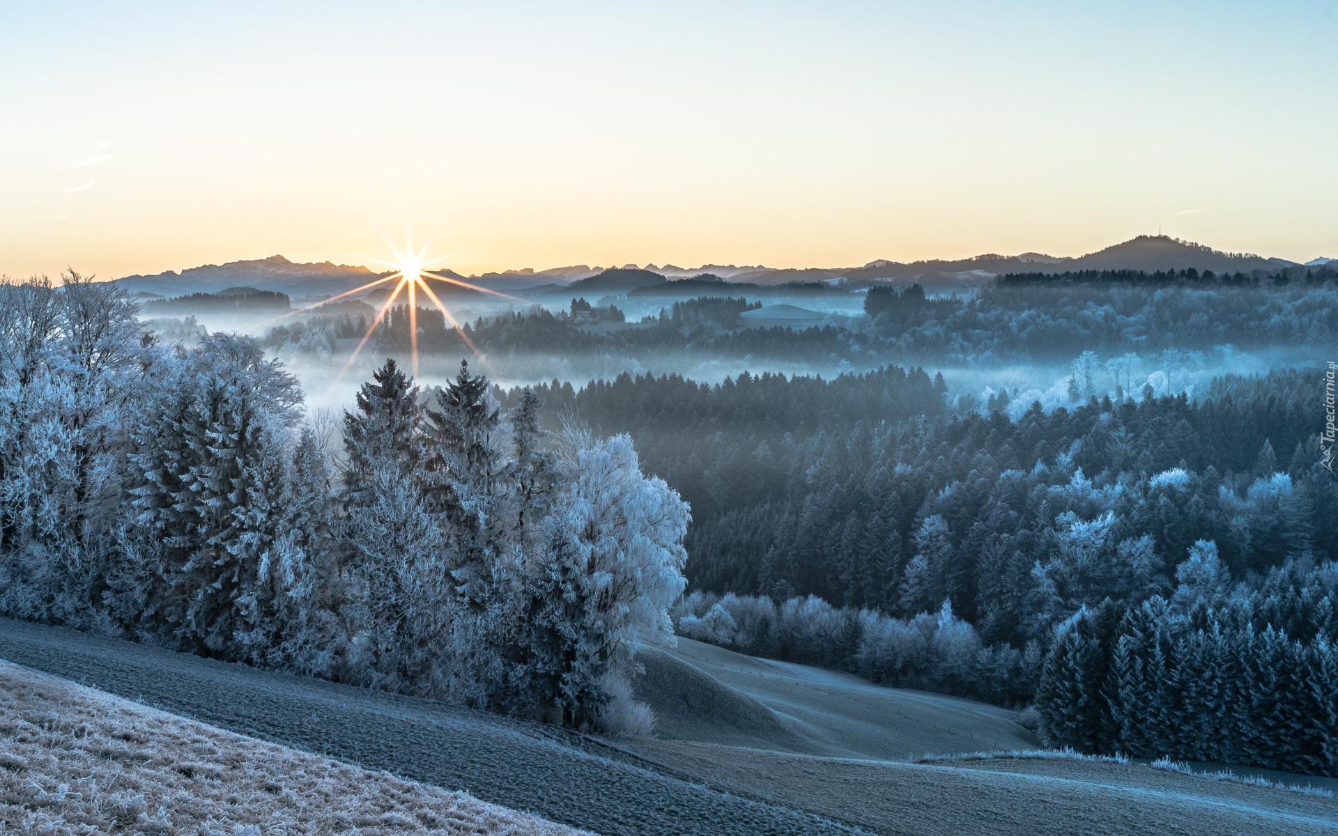 Edytor tapety: Oszronione drzewa na wzgórzach w porannym słońcu