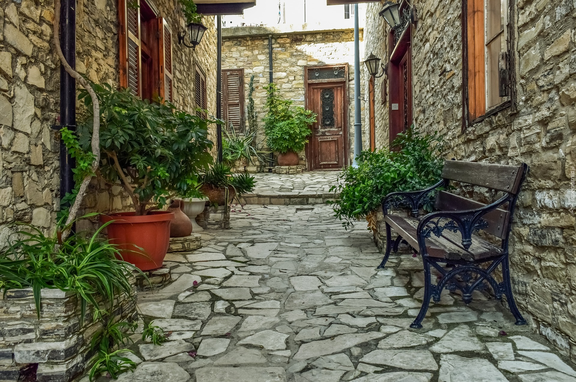Edytor tapety: Ławka na brukowanej uliczce w cypryjskiej Lefkarce