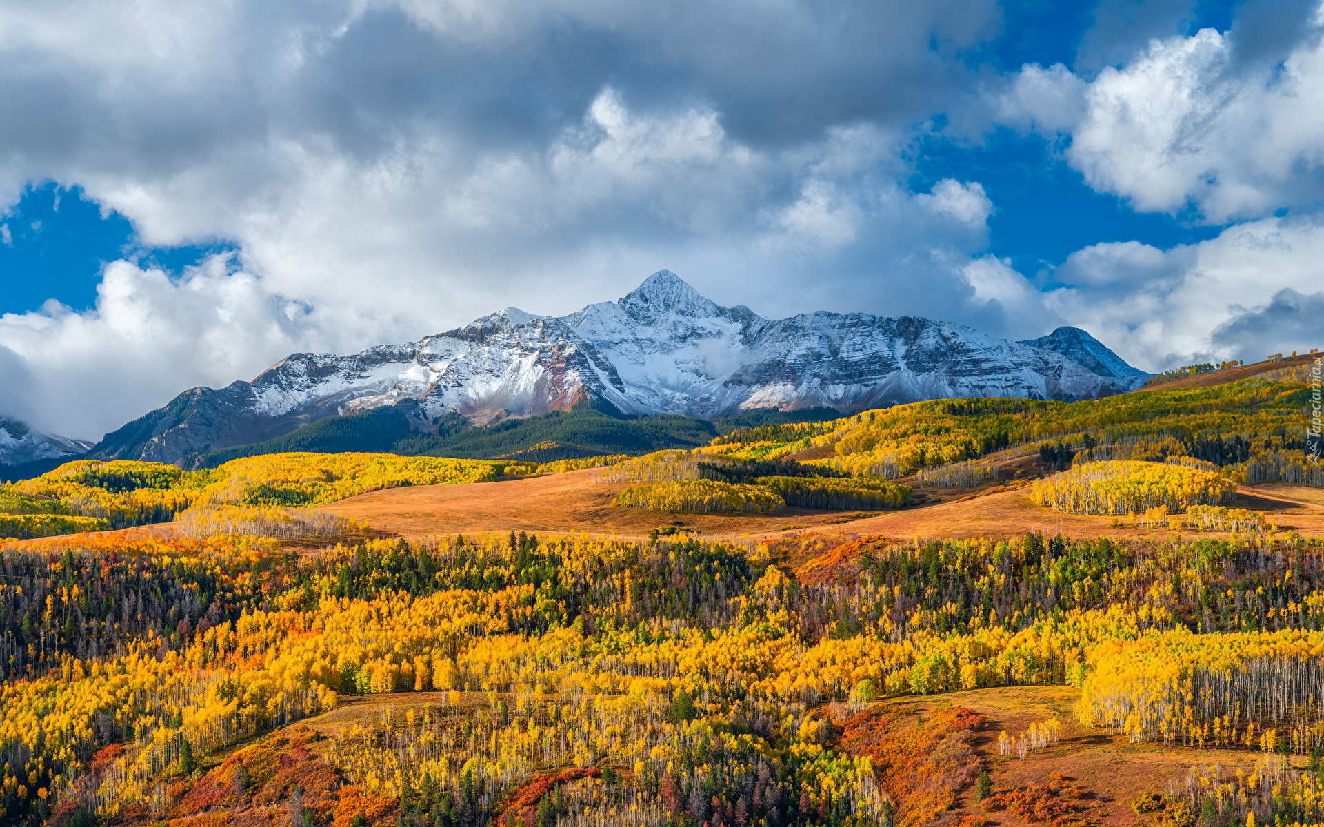 Edytor tapety: Pożółkłe lasy na tle ośnieżonych gór