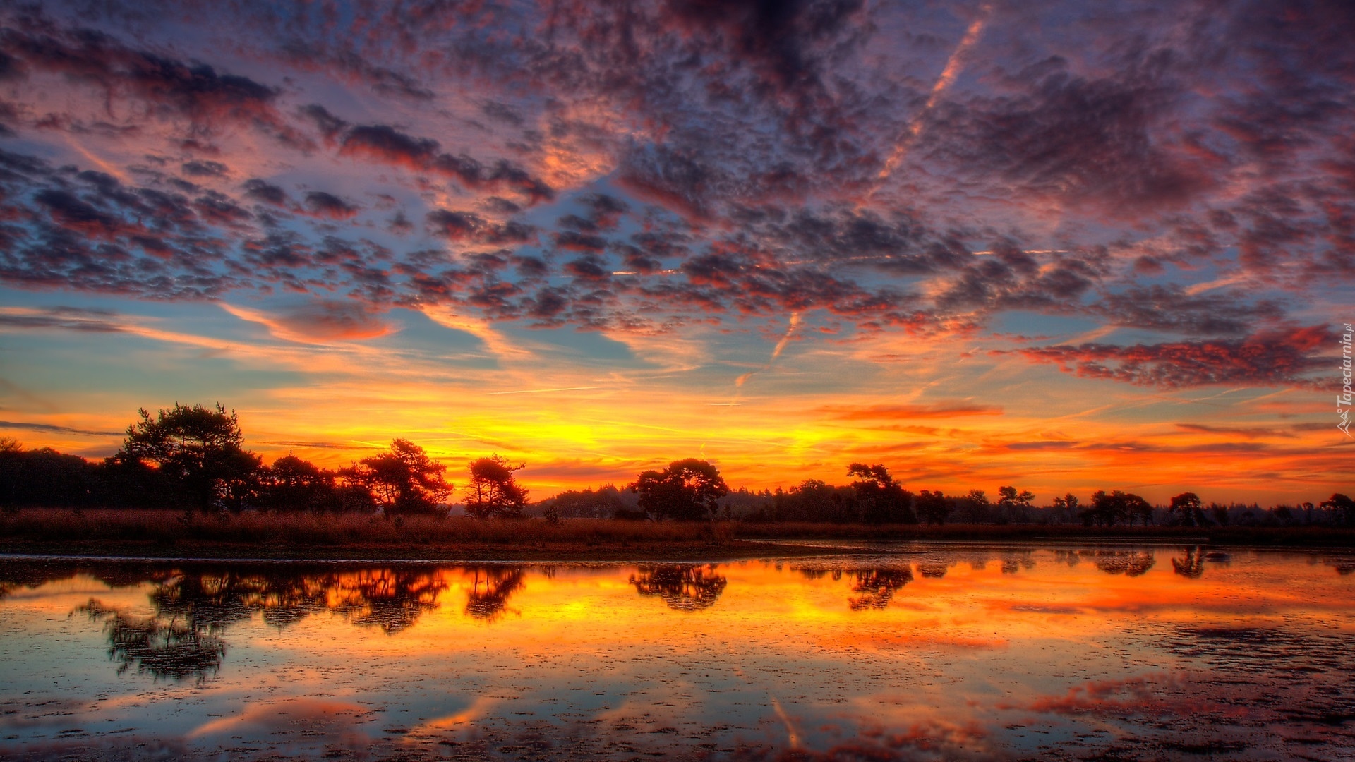 Edytor tapety: Kolorowe niebo i chmury zachodzącego słońca nad jeziorem