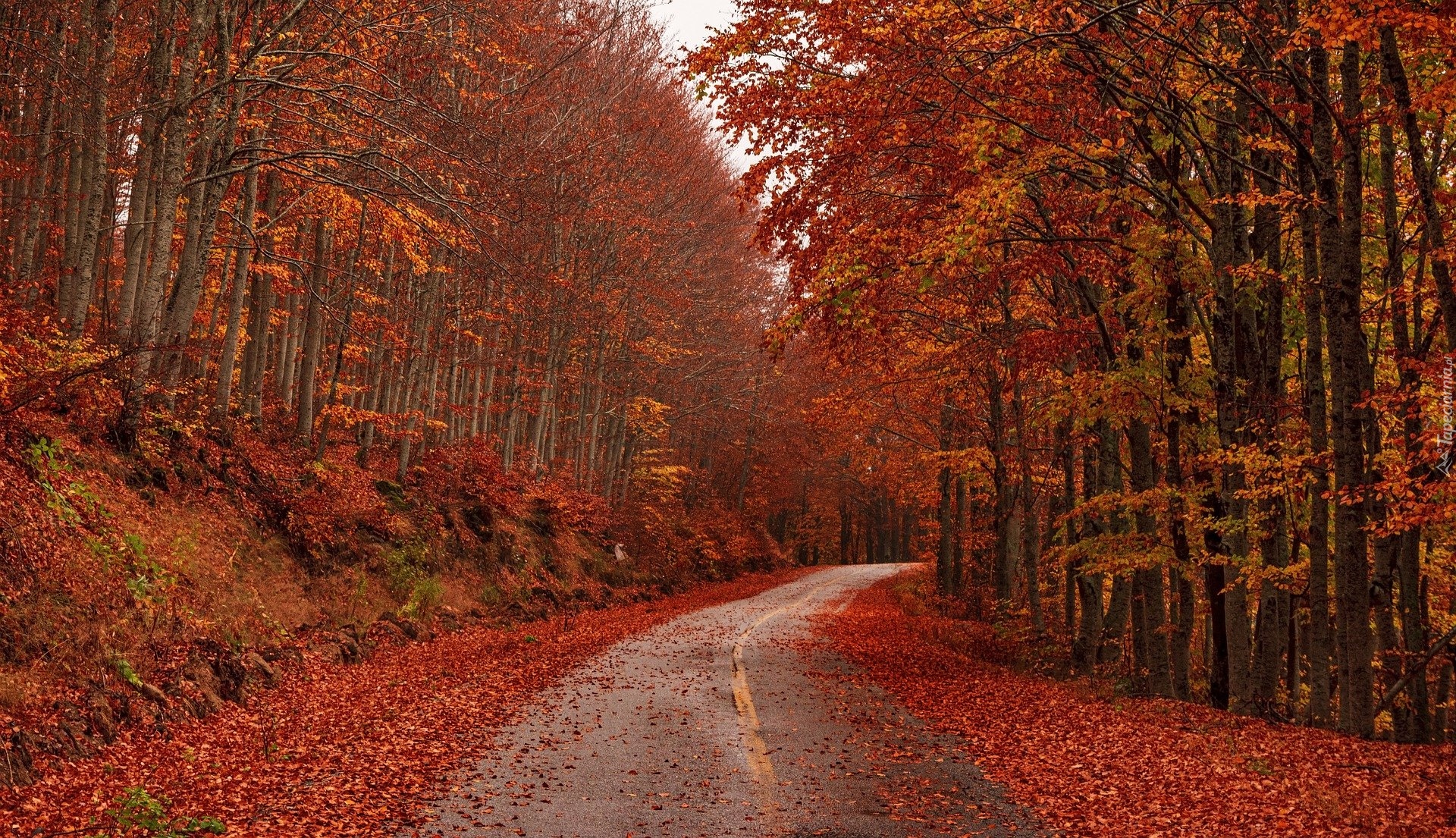 Edytor tapety: Leśna droga zasypana jesiennymi liśćmi