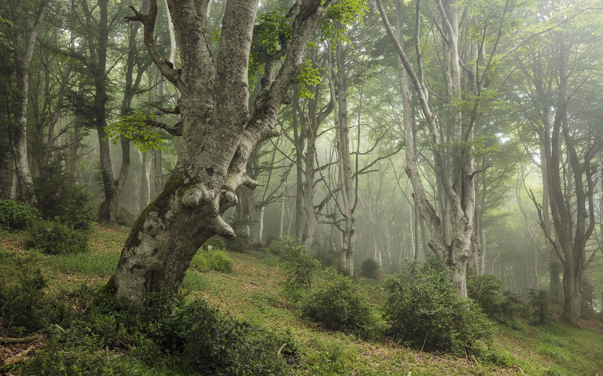 Edytor tapety: Drzewa liściaste w zamglonym lesie