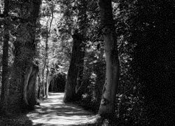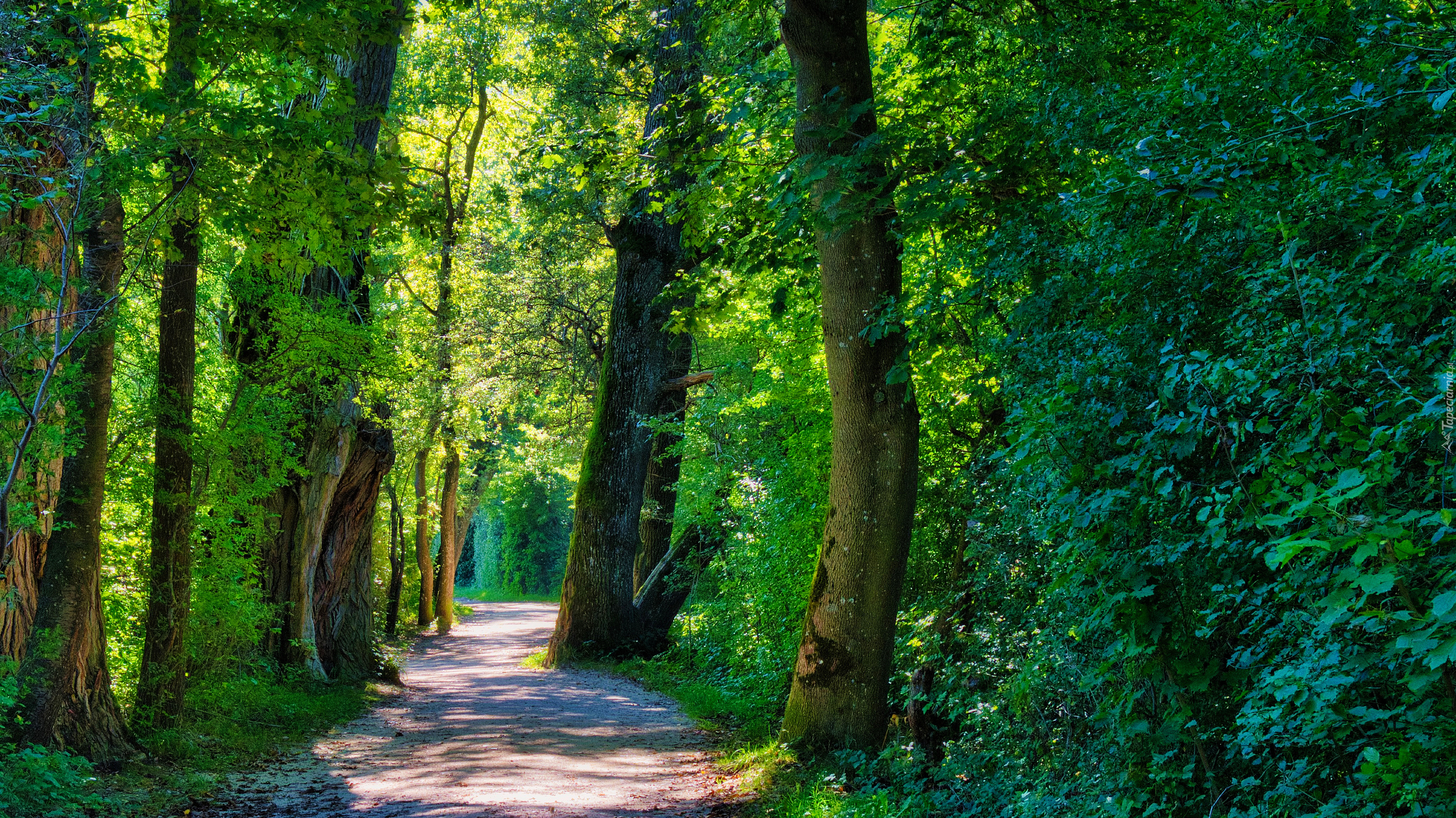 Edytor tapety: Rozświetlone słońcem zielone drzewa przy leśnej drodze