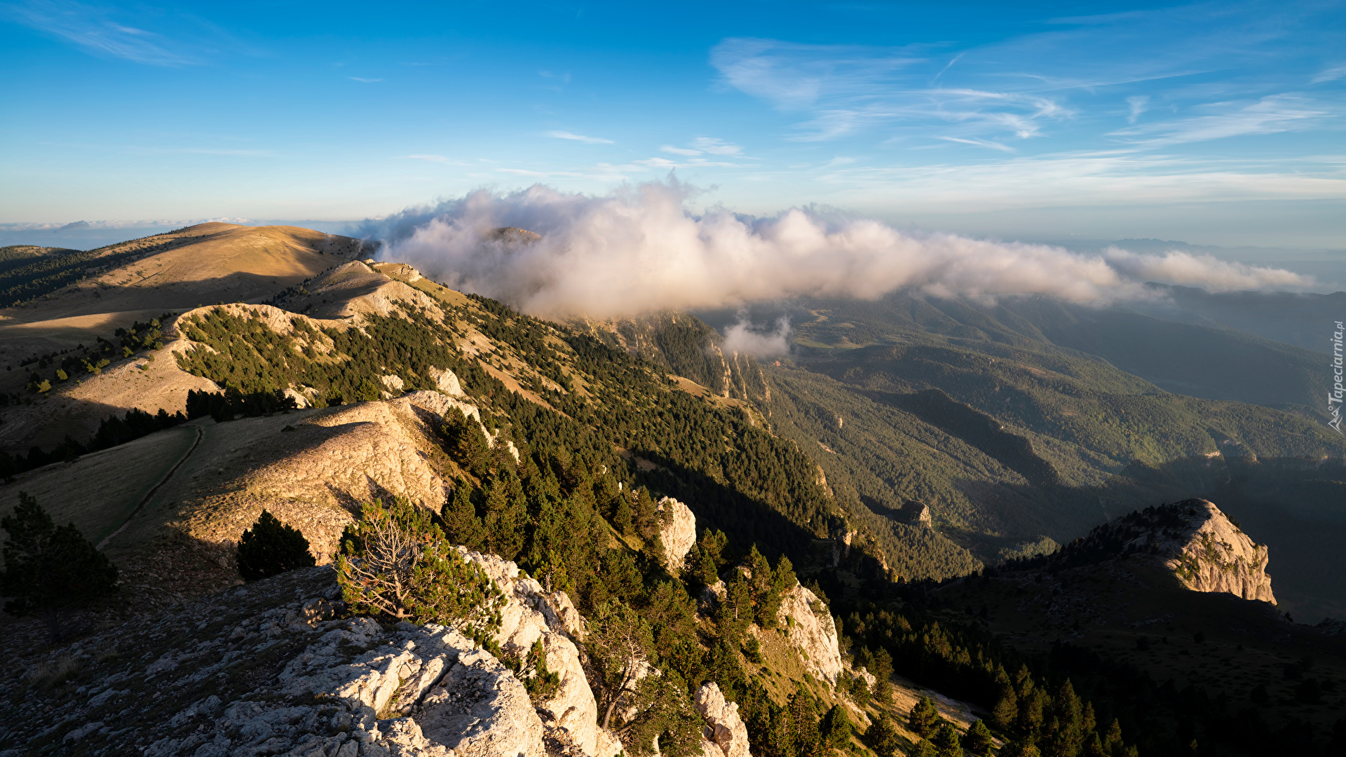 Edytor tapety: Chmury nad zalesionymi górami