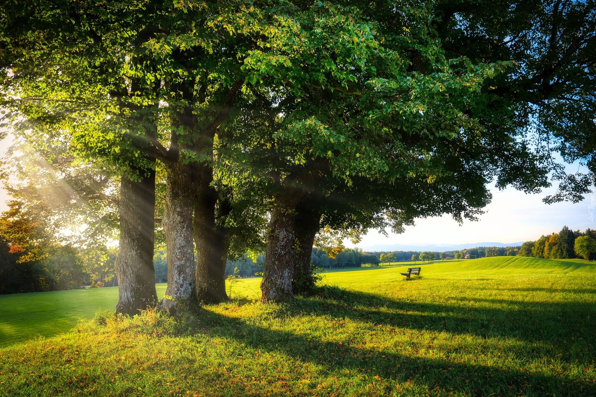 Edytor tapety: Drzewa i ławka na słonecznej łące