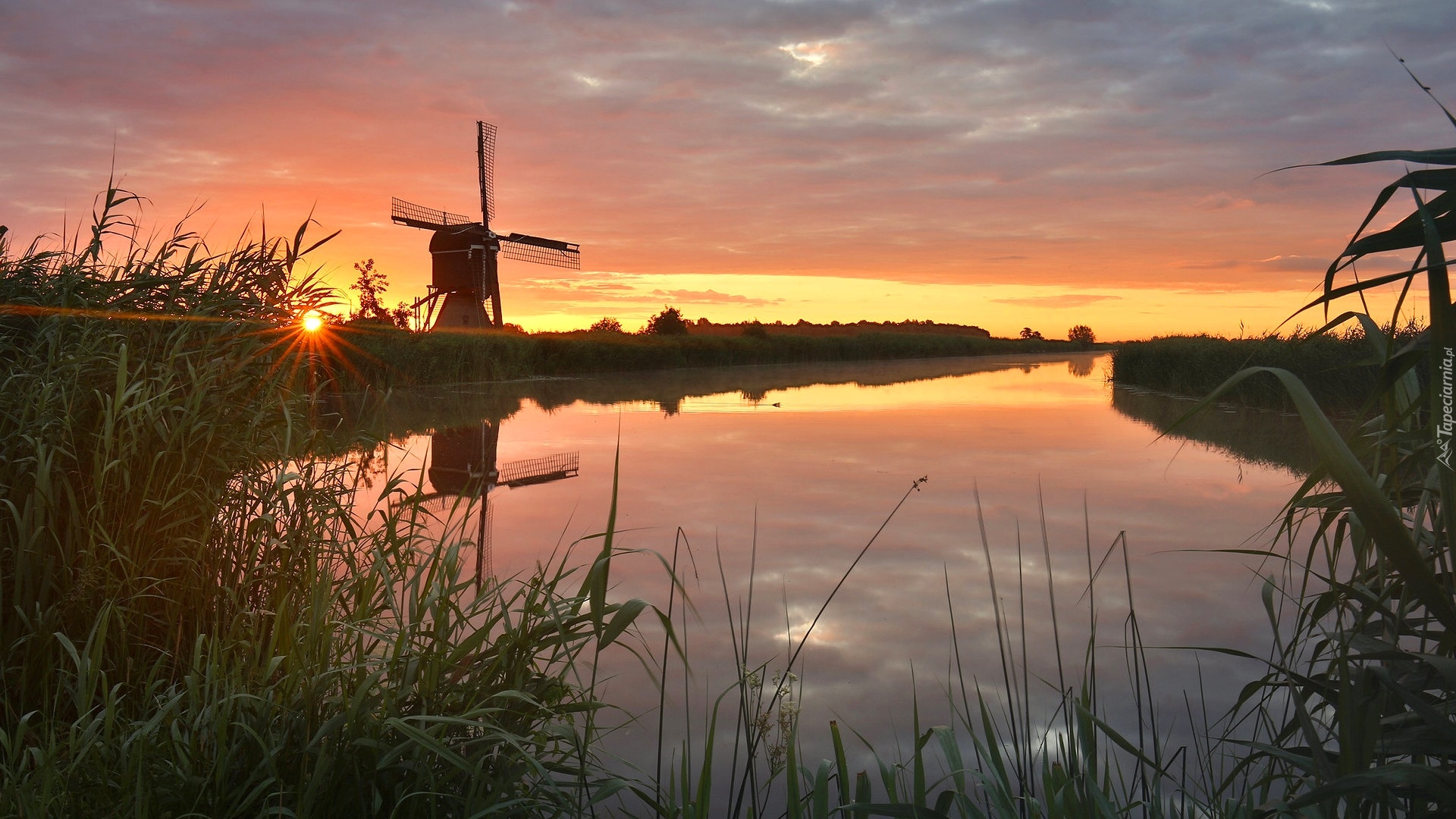 Edytor tapety: Wiatrak na brzegu rzeki w zachodzącym słońcu