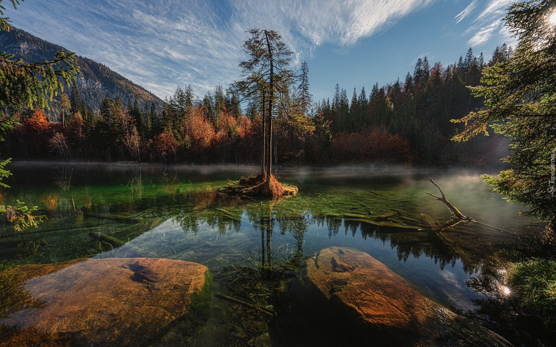 Edytor tapety: Skały i drzewa nad jeziorem w górach