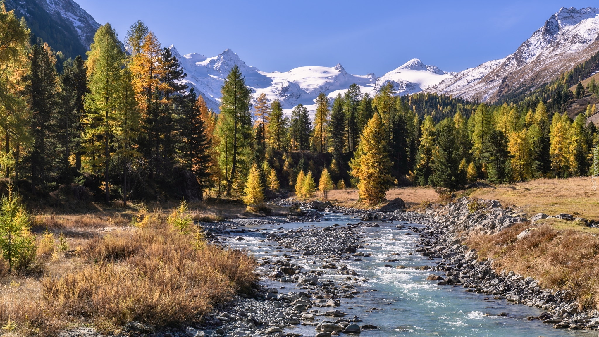 Edytor tapety: Rzeka i jesienne drzewa na tle ośnieżonych Alp