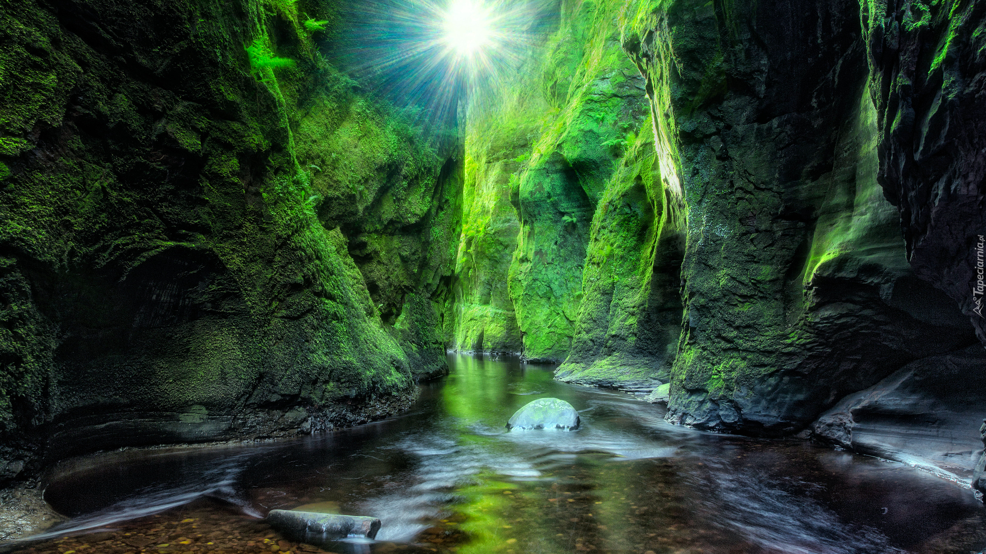 Edytor tapety: Promienie słońca na omszałych skałach w wąwozie rzeki