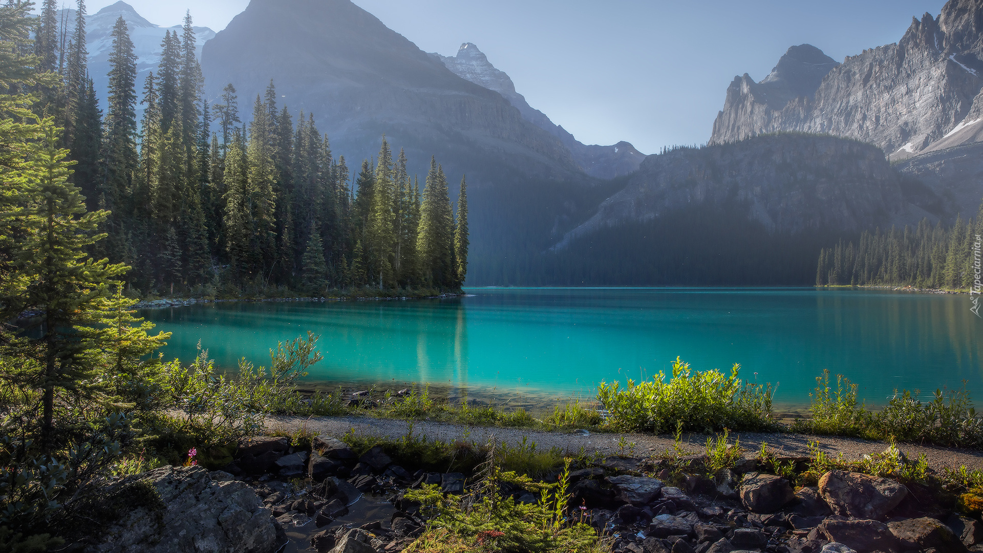 Edytor tapety: Drzewa iglaste nad górskim jeziorem