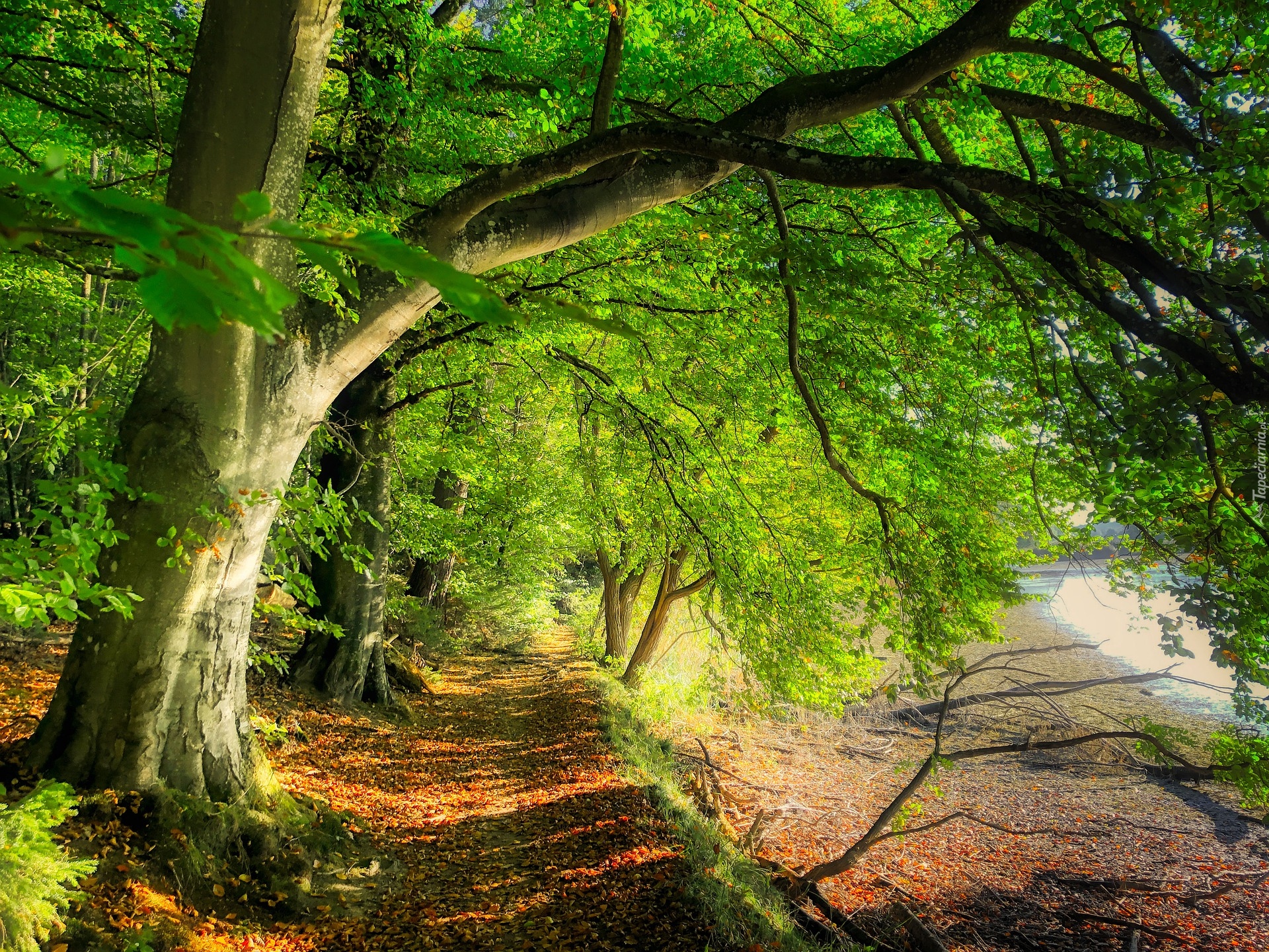Edytor tapety: Pochylone gałęzie zielonych drzew nad ścieżką
