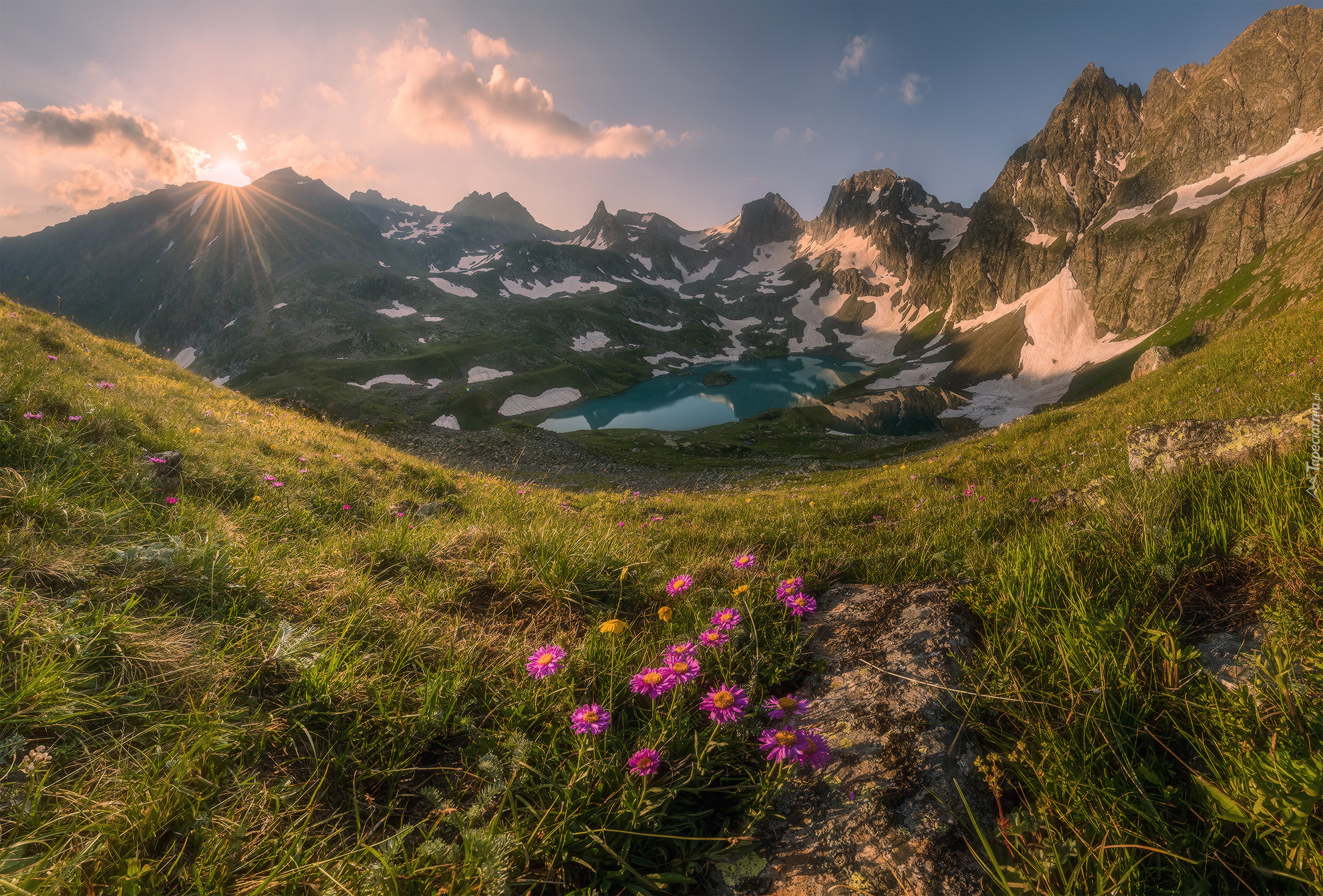 Edytor tapety: Kwiaty na tle gór w promieniach słońca