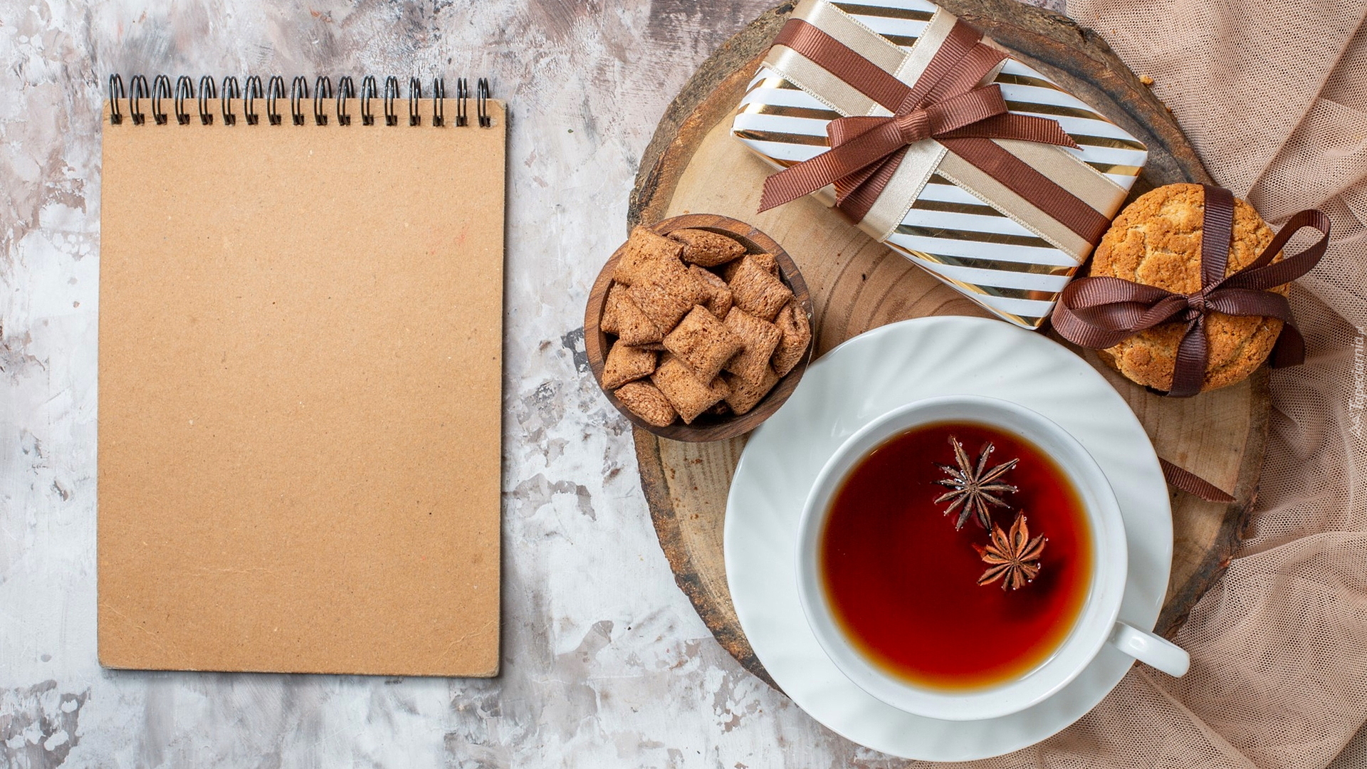 Edytor tapety: Notes obok deski z herbatą i ciasteczkami