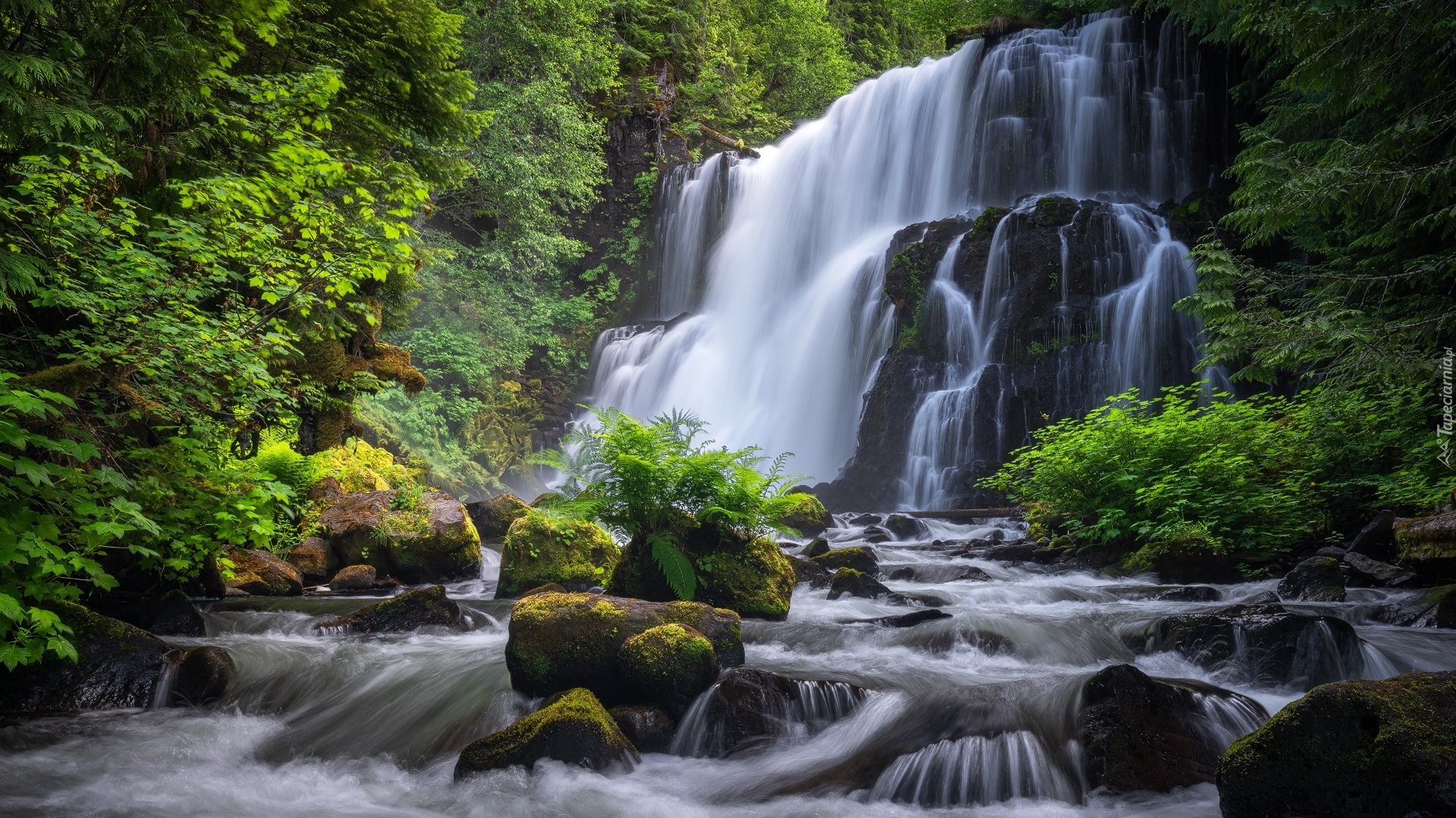 Edytor tapety: Leśny wodospad na skałach wpadający do kamienistej rzeki