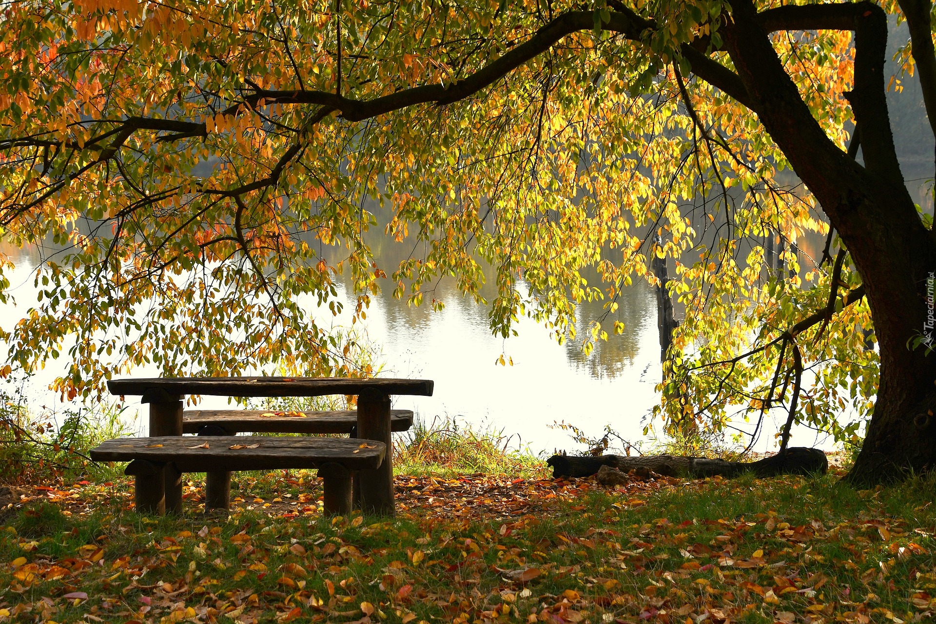 Edytor tapety: Ławka pod drzewem ze zwisającymi gałęziami