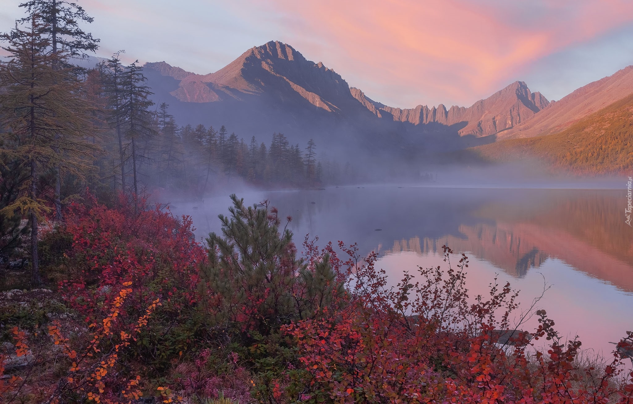 Edytor tapety: Kolorowe rośliny i masyw Angachak nad jeziorem Nevidimka